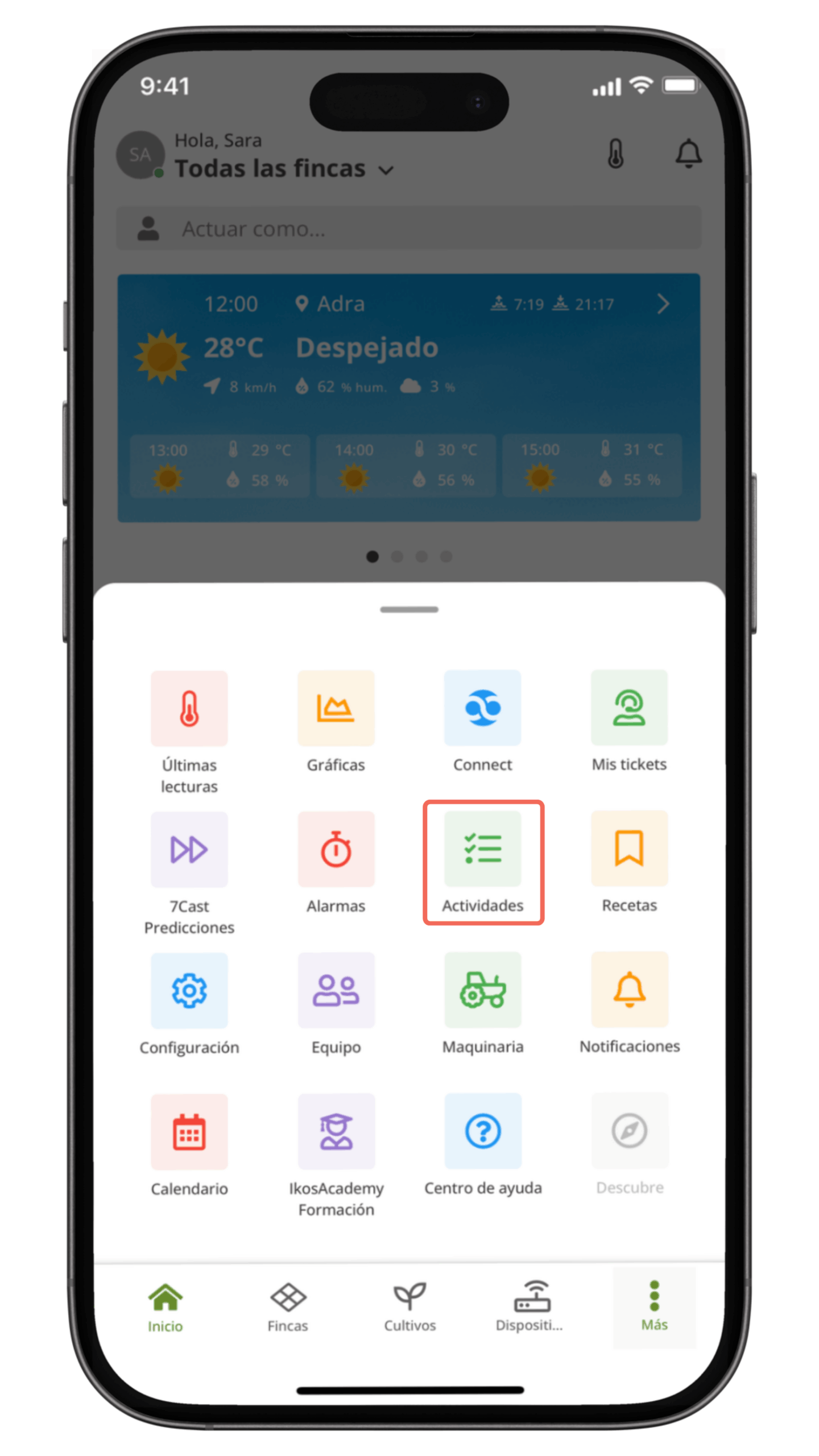 - Desde el menú inferior, pulsa Más y selecciona Actividades en el listado de opciones.