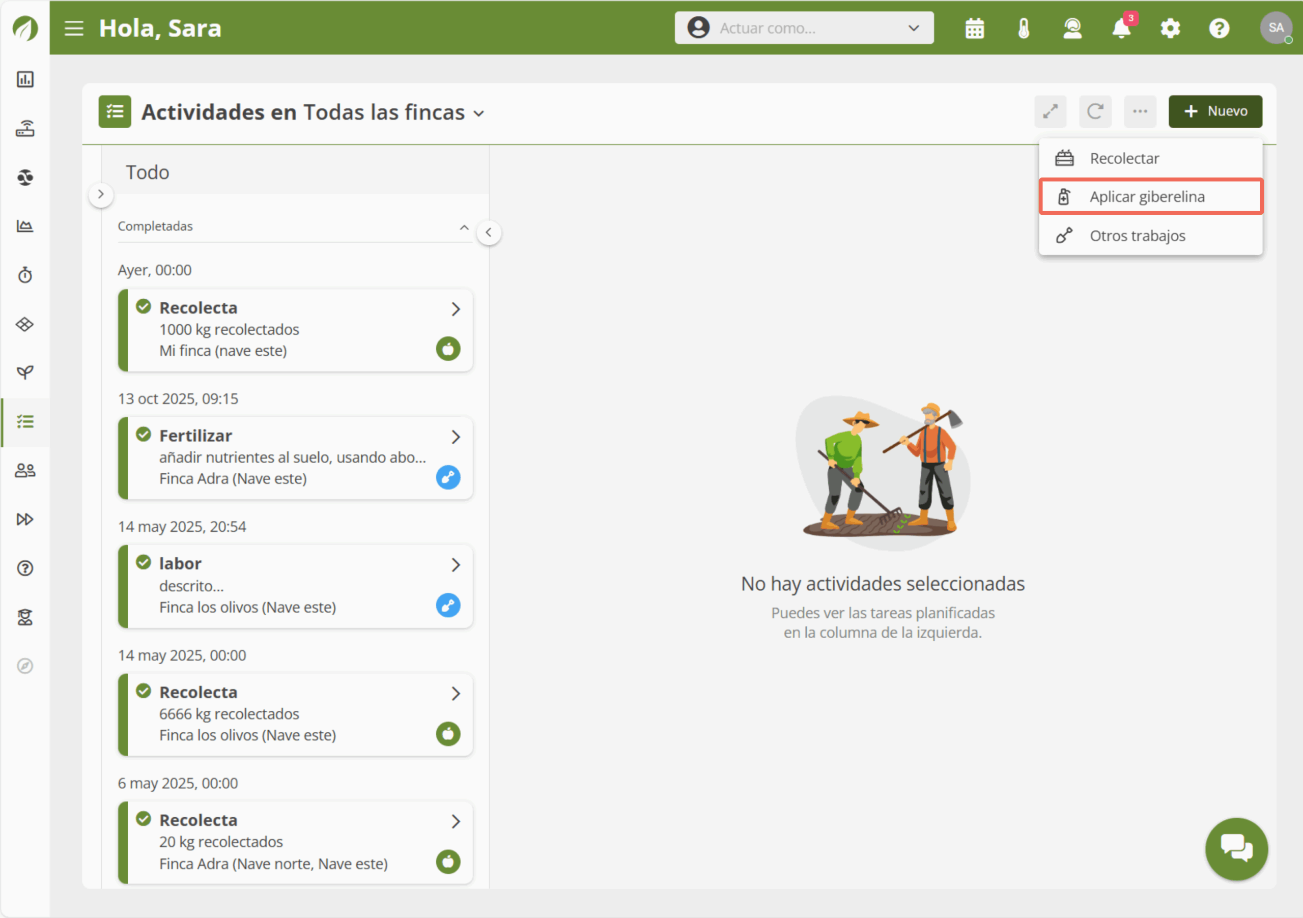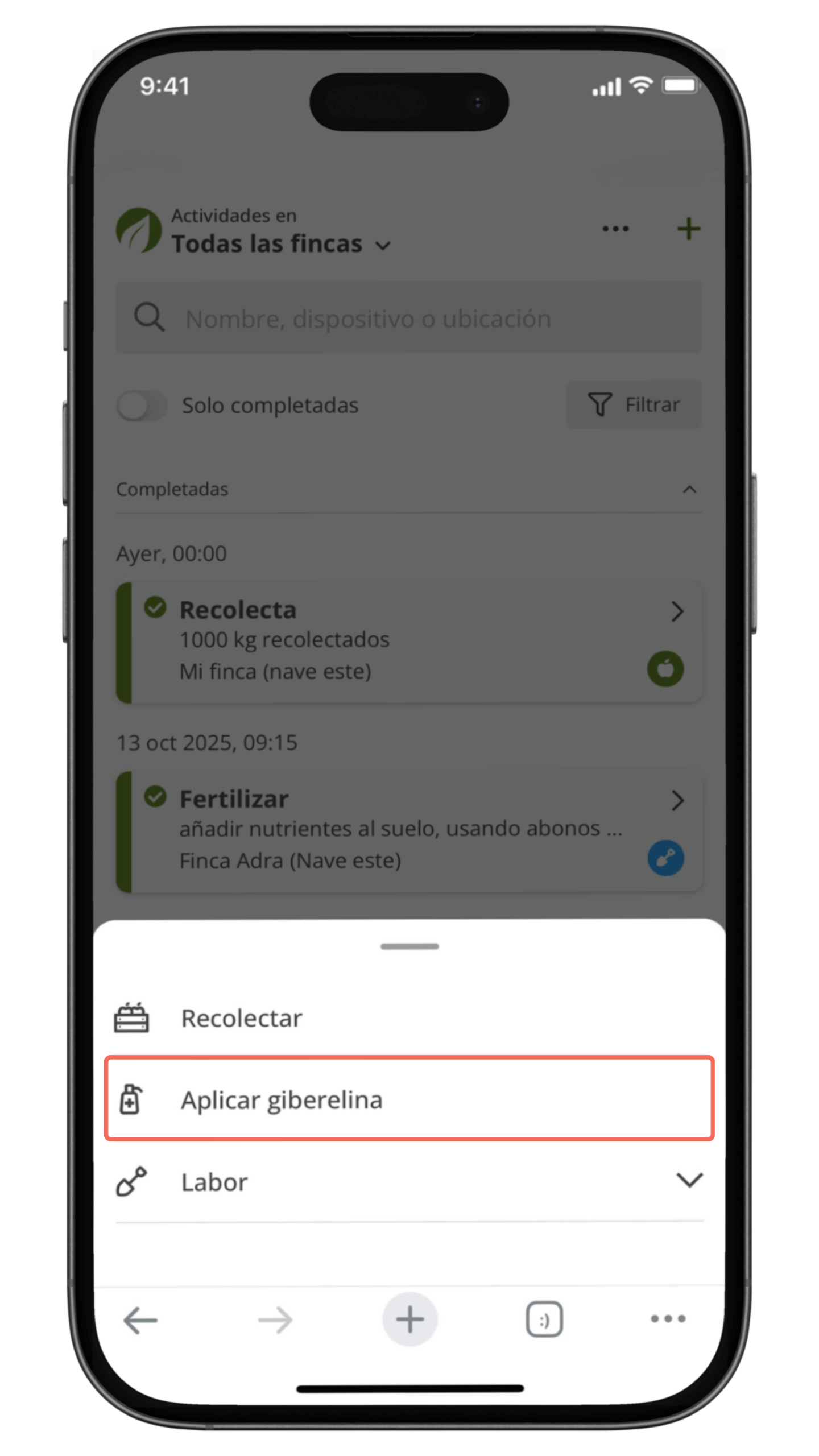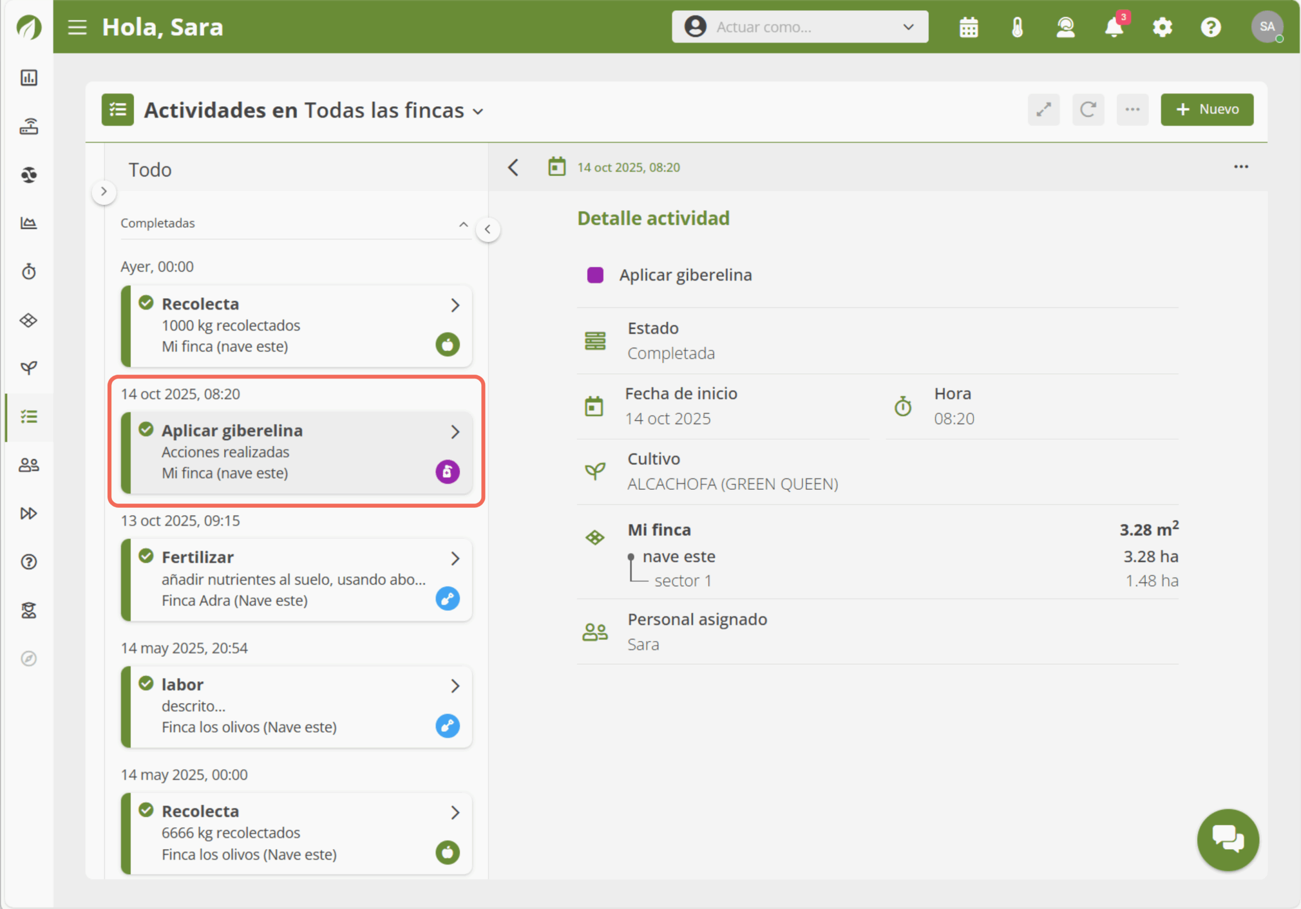 - La actividad quedará guardada como Aplicar giberelina dentro del listado de Actividades.