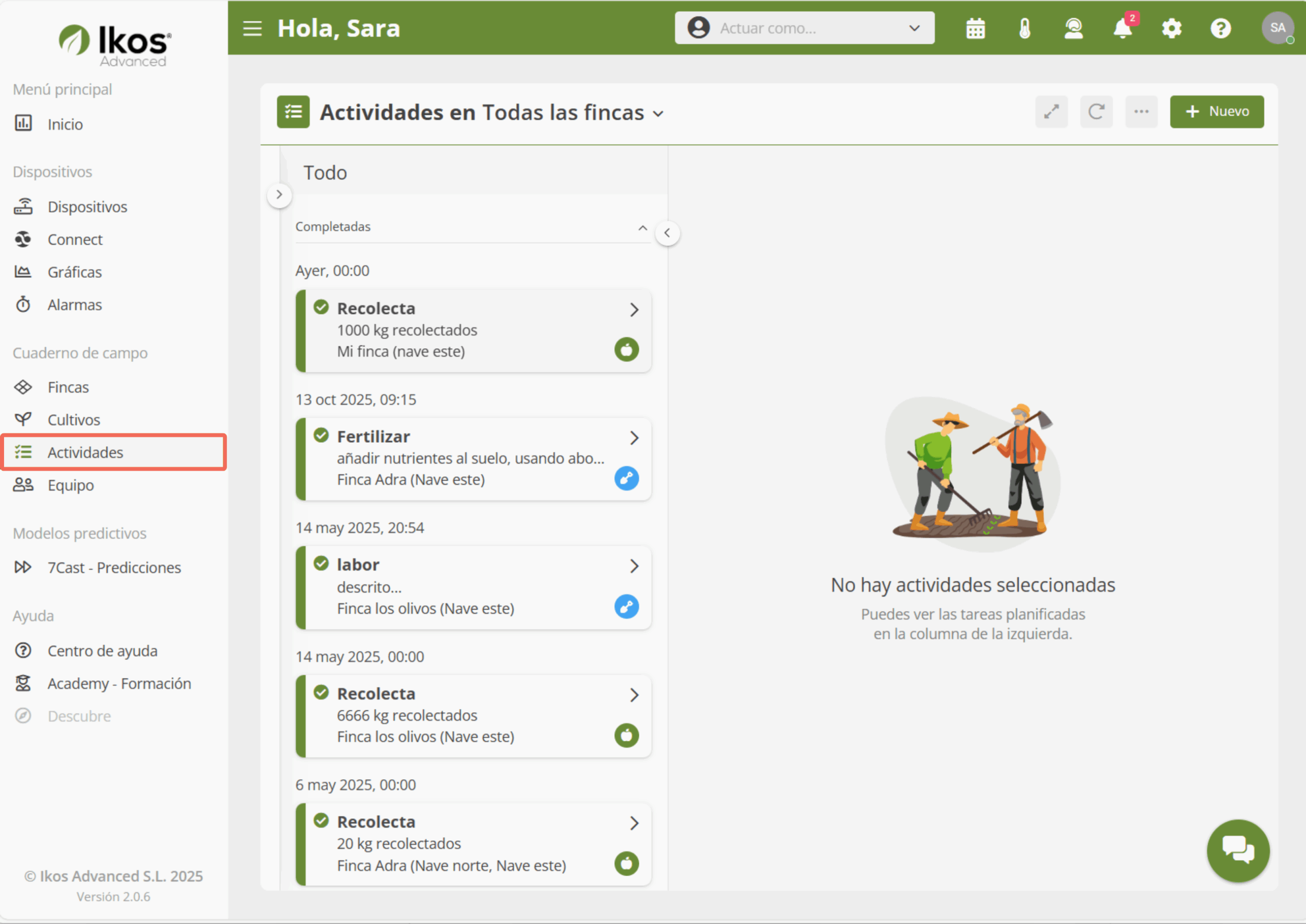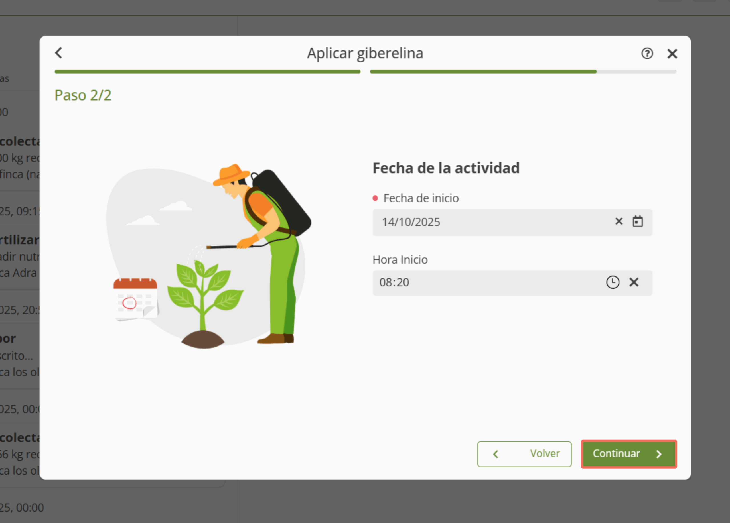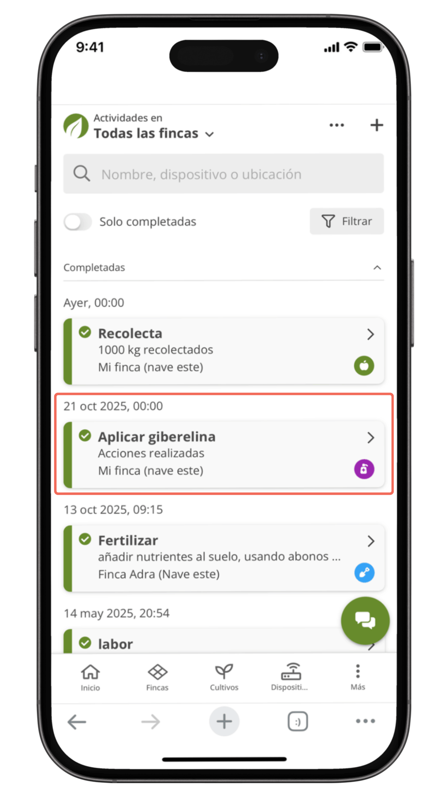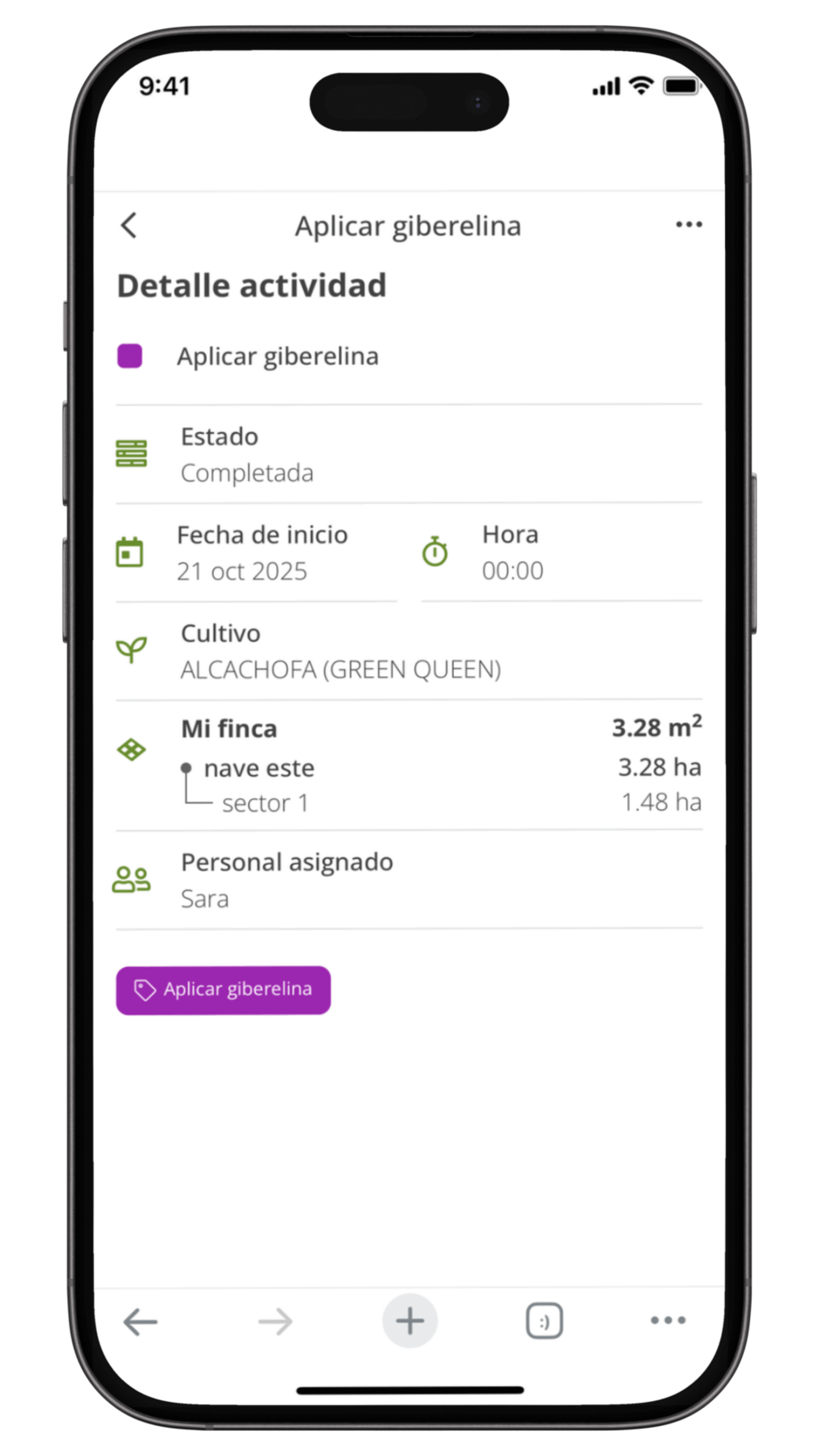 - La actividad quedará guardada como Aplicar giberelina dentro del listado de Actividades.