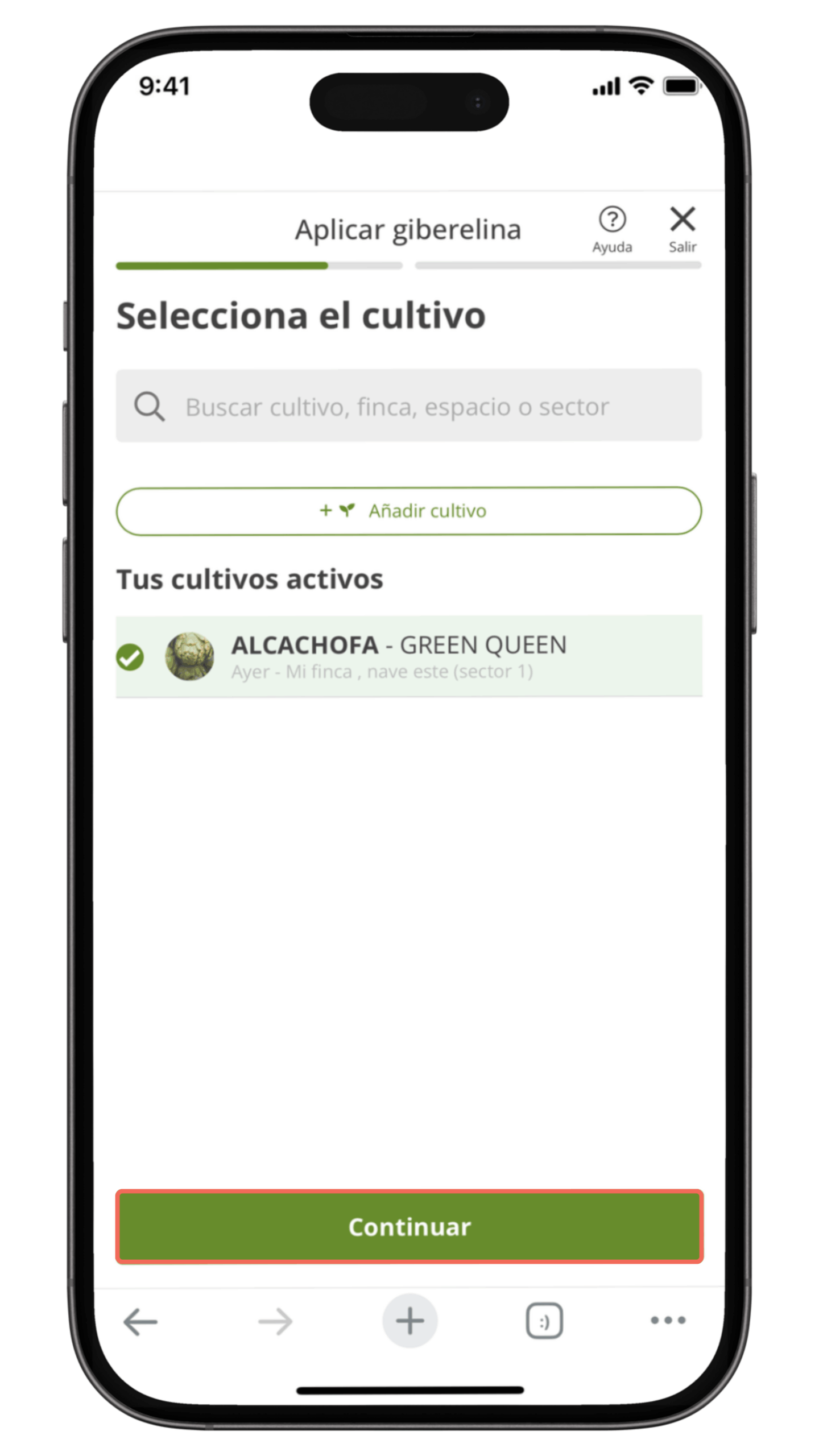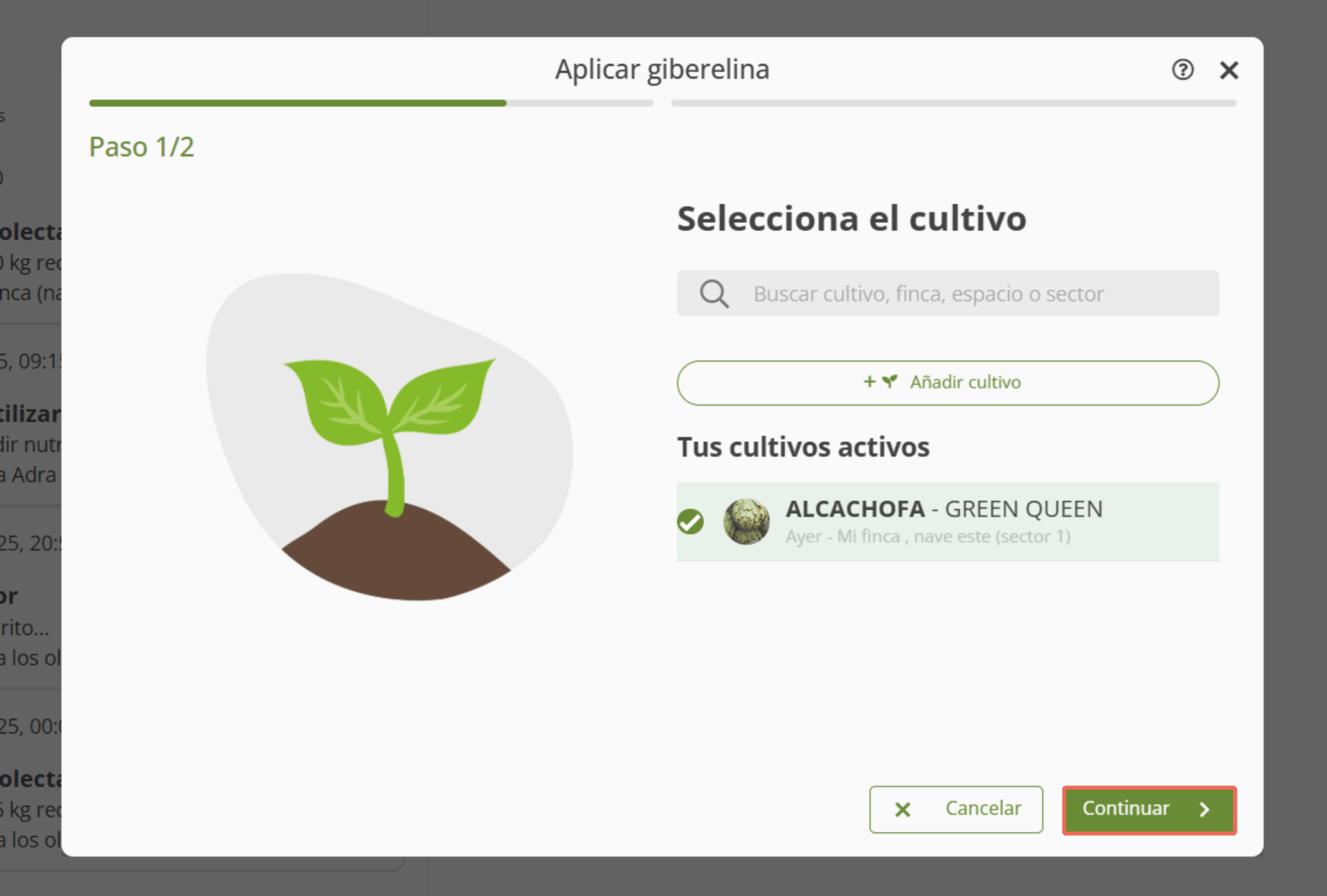 - Selecciona el cultivo Alcachofa – Green Queen y haz clic en Continuar para avanzar.