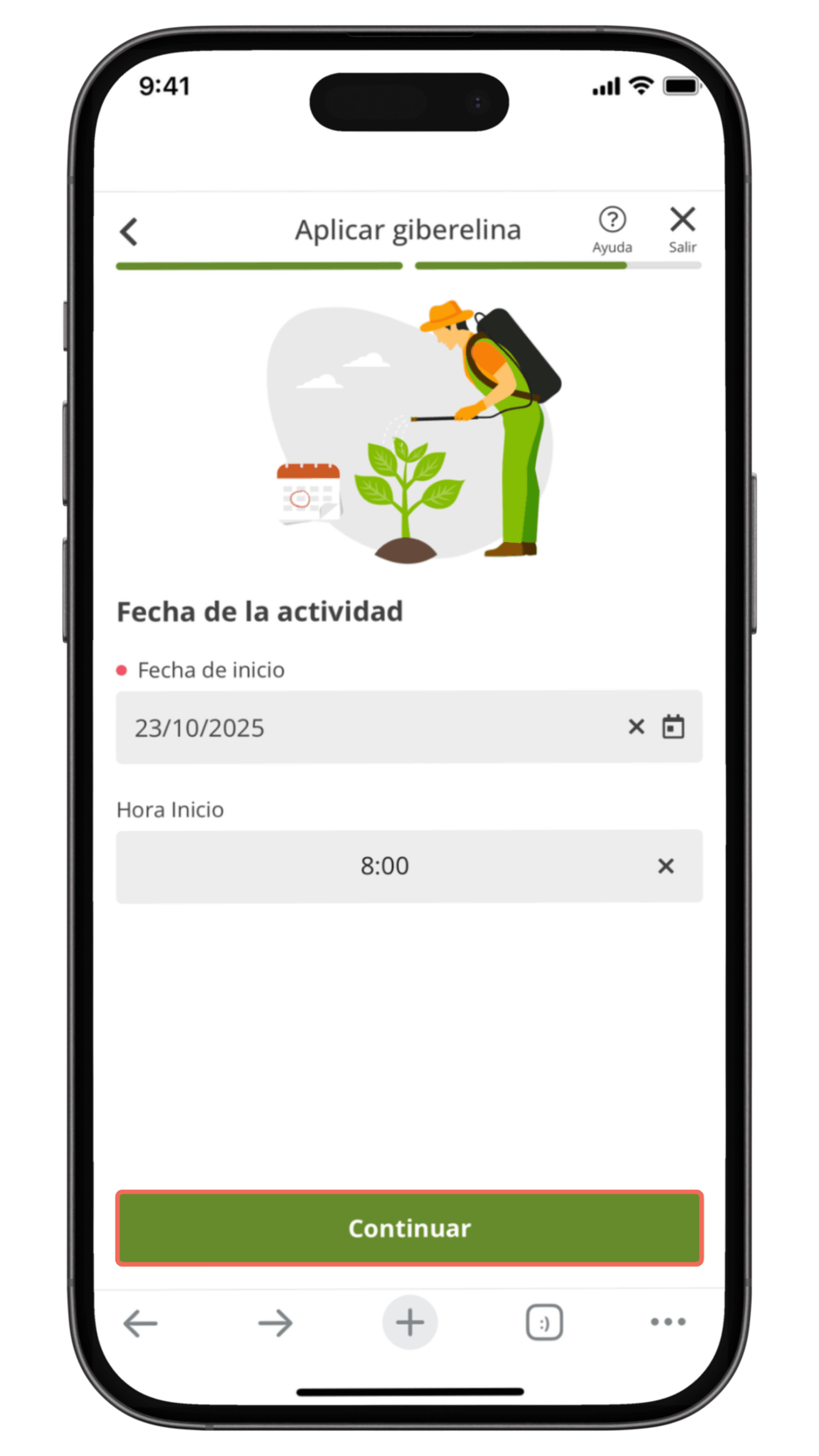 - La actividad se mostrará como Aplicar giberelina dentro del listado de Actividades, junto con los detalles de fecha, hora y cultivo.