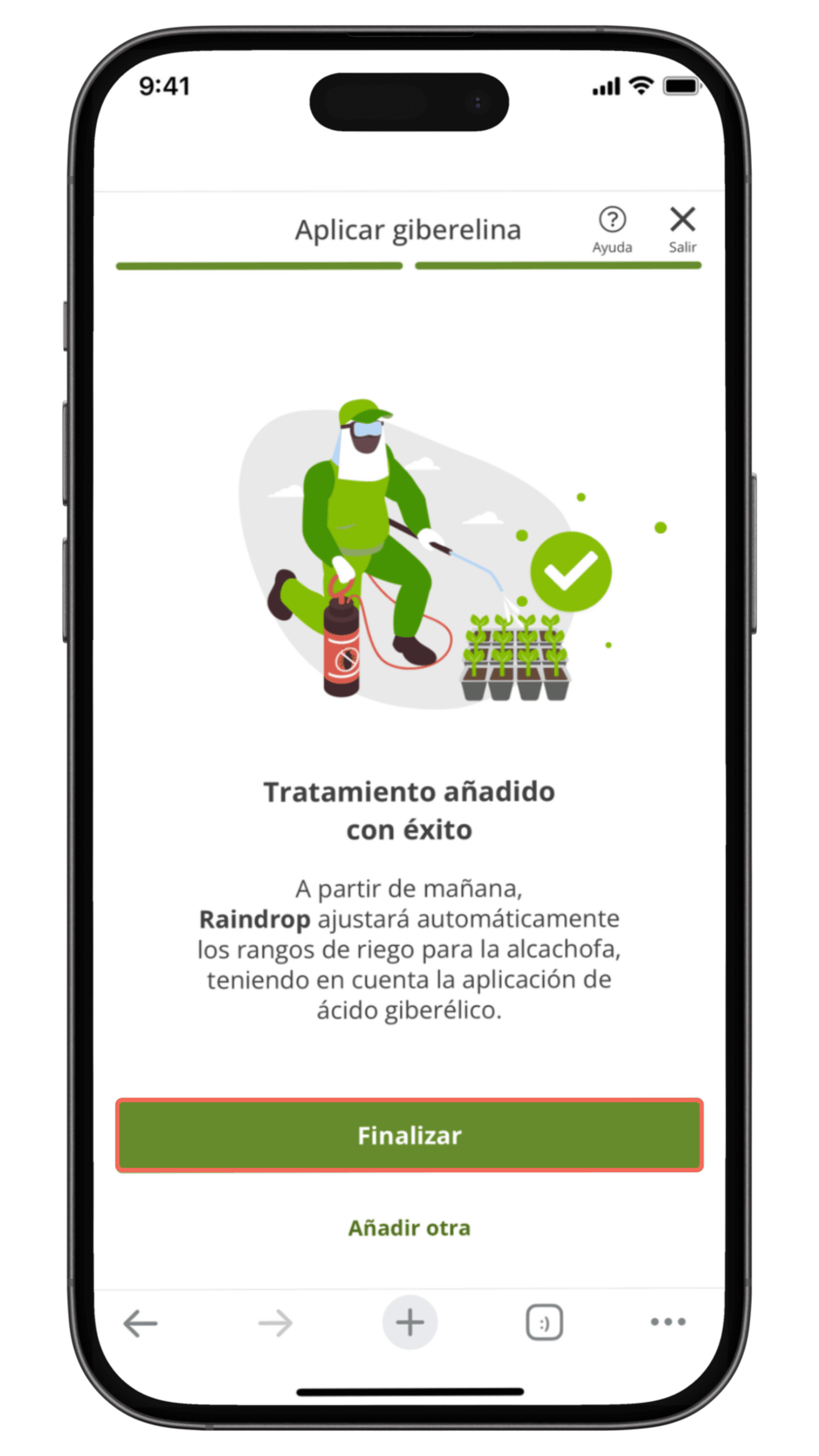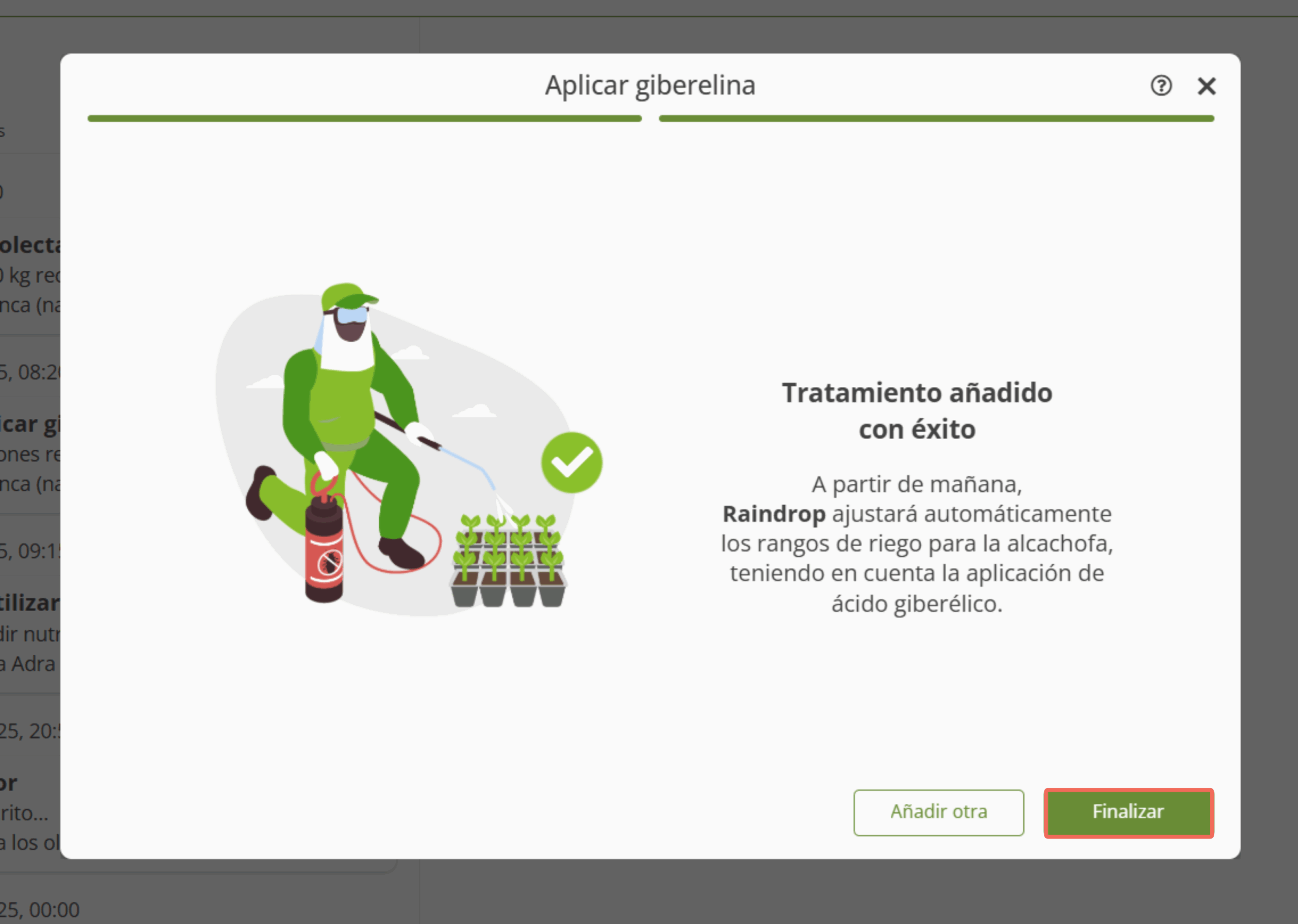 - Aparecerá el mensaje “Tratamiento añadido con éxito”. A partir de ese momento, Raindrop ajustará automáticamente los rangos de riego del cultivo teniendo en cuenta la aplicación del ácido giberélico.