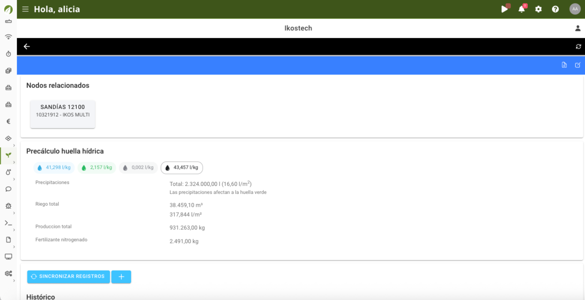 - Resultado del precálculo de huella hídrica: Se muestra la HH verde, azul y gris ya calculadas y actualizadas según datos reales.