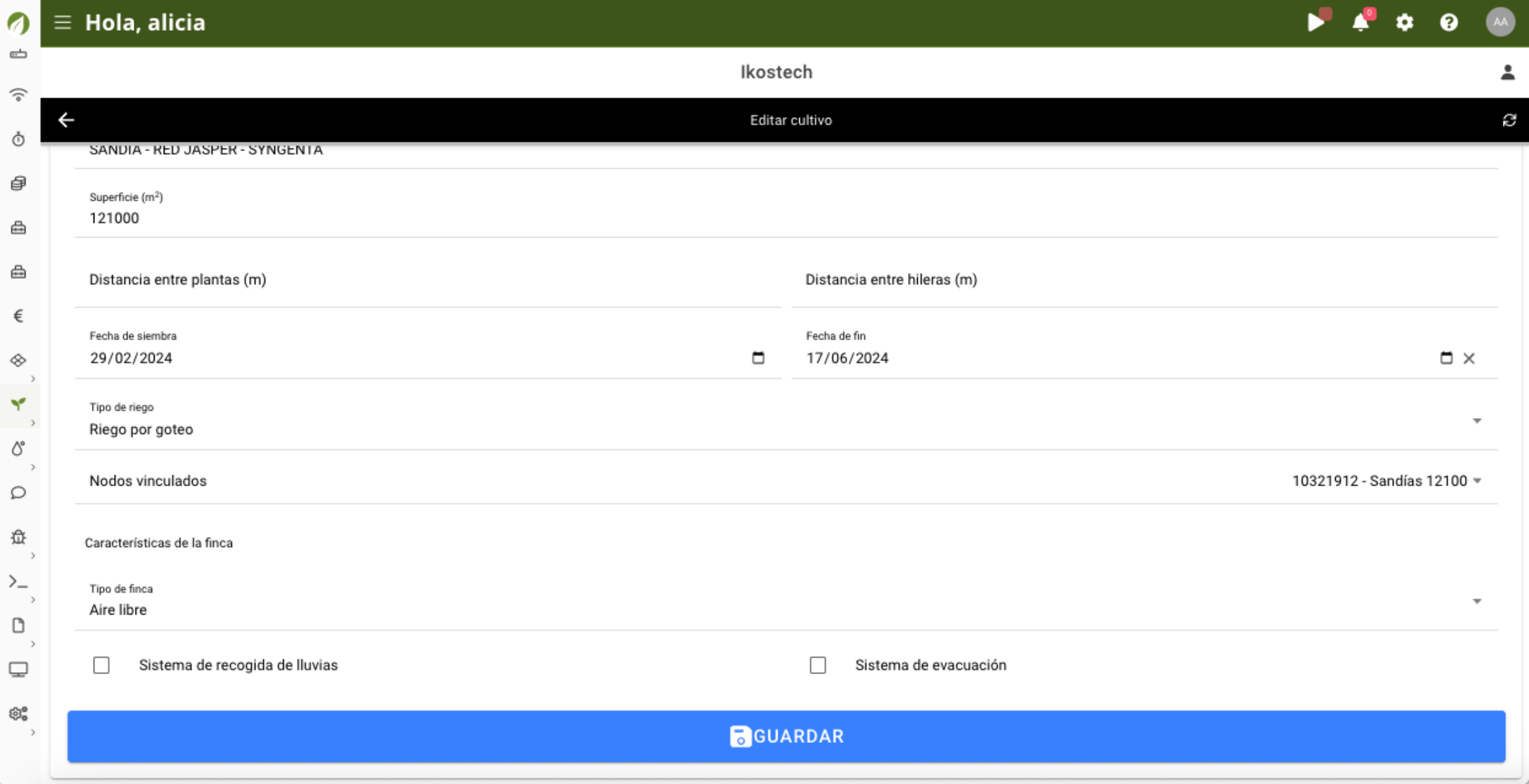 - Configuración detallada de la campaña agrícola: Desde el tipo de riego hasta los sistemas de recogida o evacuación.