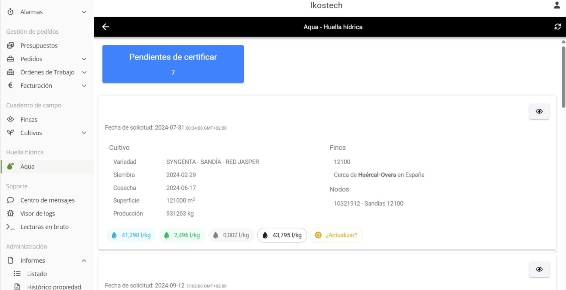 IKOS Aqua es la plataforma de IKOS que registra, calcula y certifica la huella hídrica de cada parcela siguiendo el protocolo internacional Water Footprint Network (WFN). Gracias a la sensorización y la analítica de datos, obtienes tu indicador en litros de agua por kilogramo de producto, listo para presentar a certificadoras y clientes.