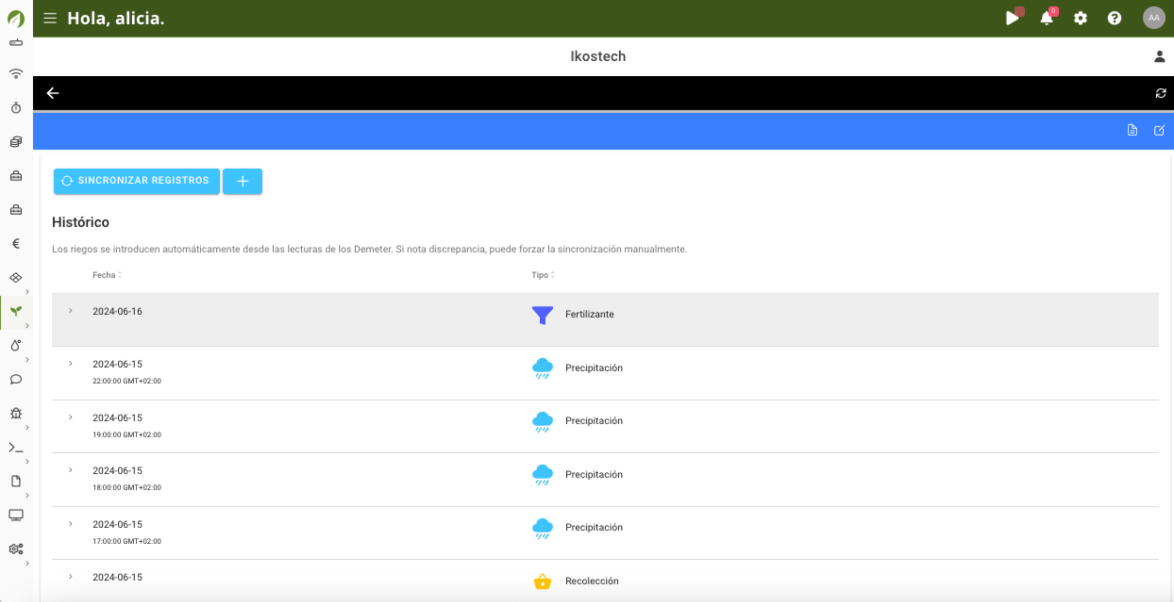 - Histórico de registros de riego, lluvias y fertilizantes: Todos los eventos quedan almacenados y listos para ser revisados en la auditoría.