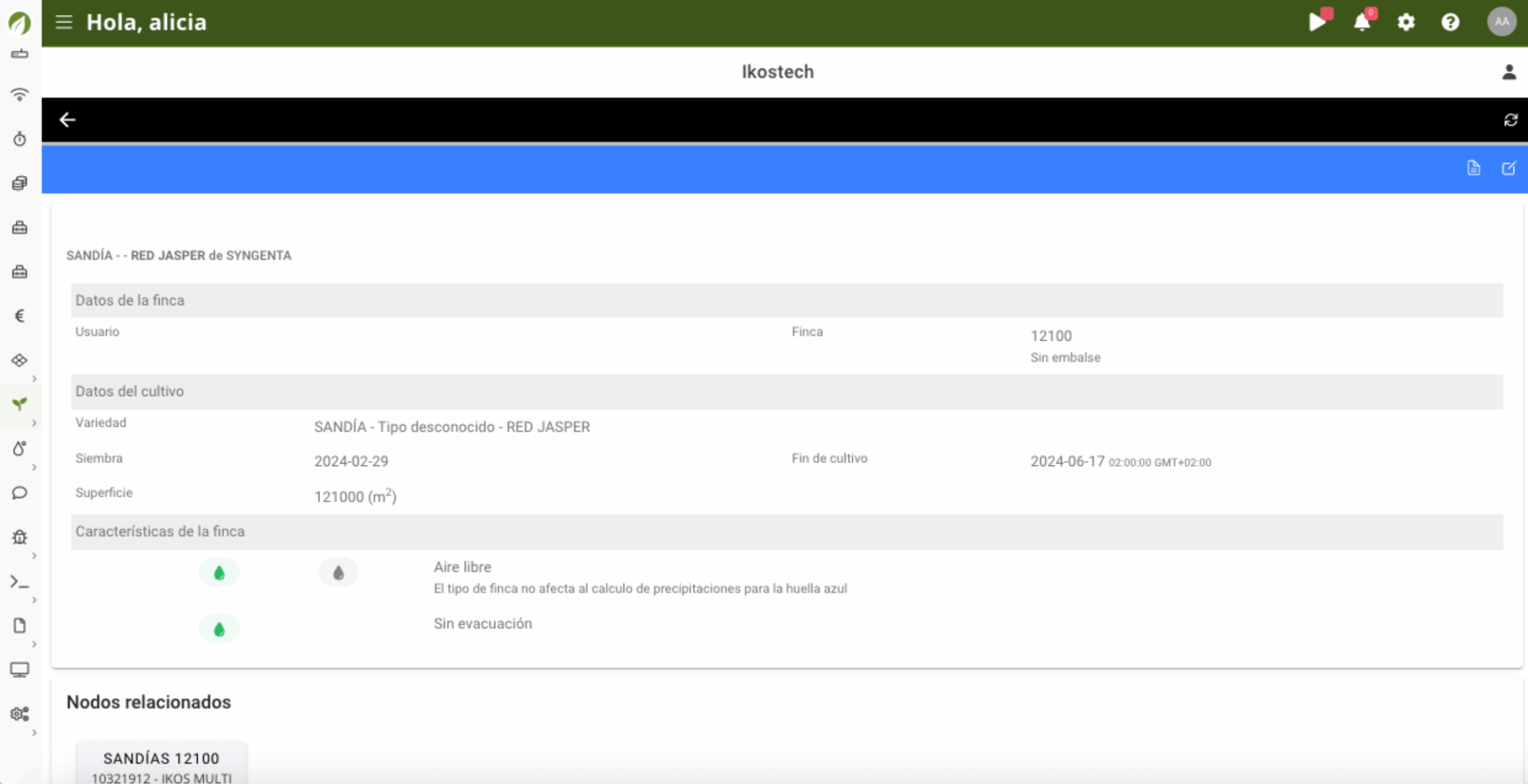| Equipamiento | Invernadero o exterior, embalse, capacidad, equipos IKOS instalados | Agricultor + IKOS |