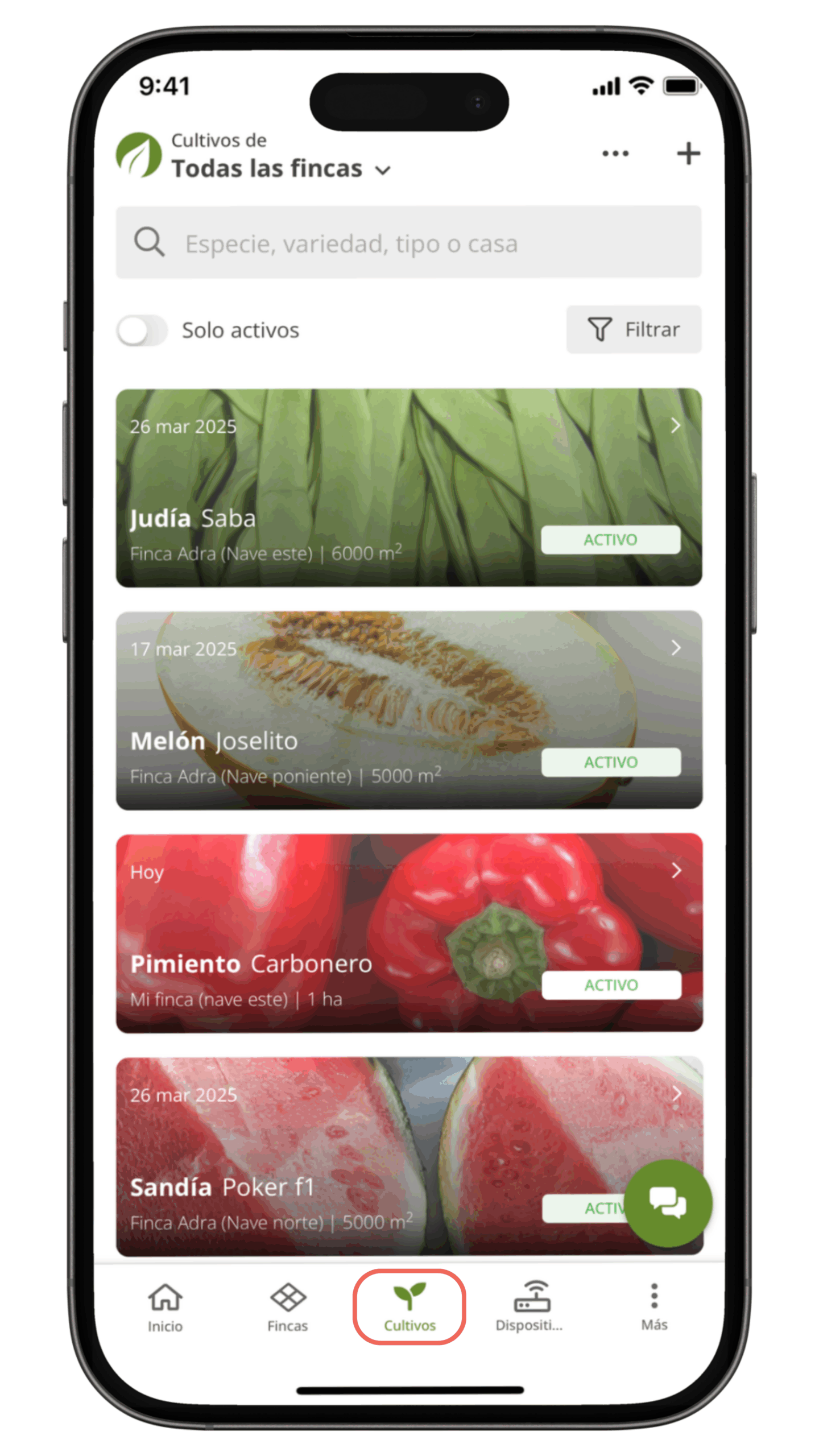 - Pulsa el icono de Cultivos en el menú inferior. Verás el listado de los cultivos activos en tus fincas.