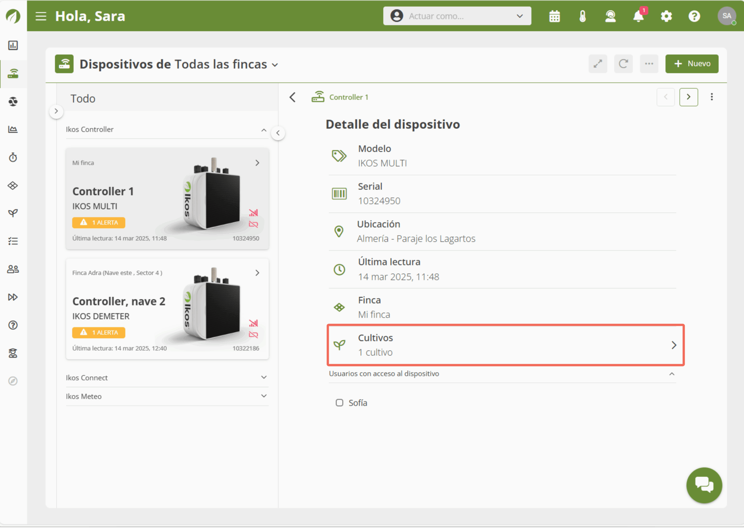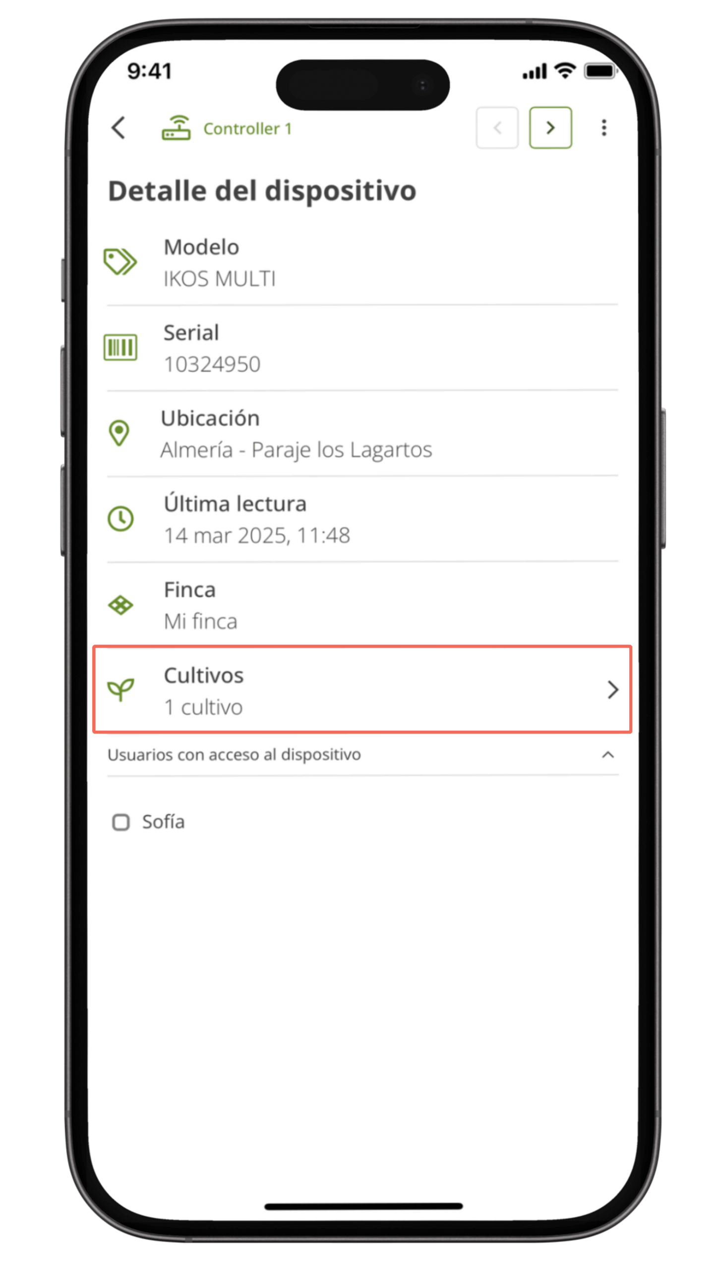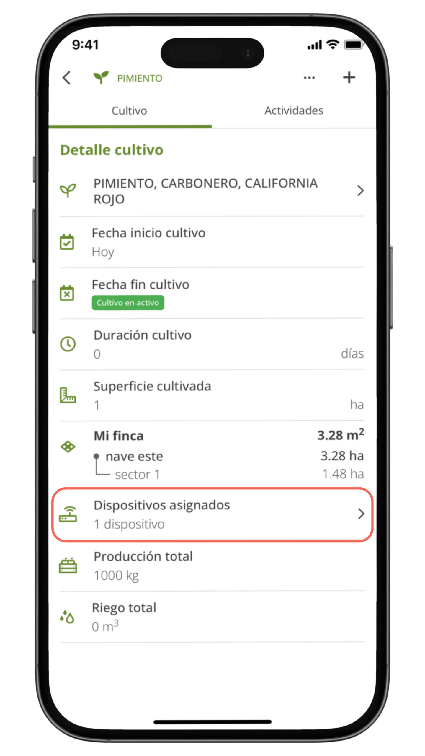 - En la pantalla Detalle del dispositivo verás toda la información del equipo y, en la sección Cultivos, los que están asociados a ese equipo 📋