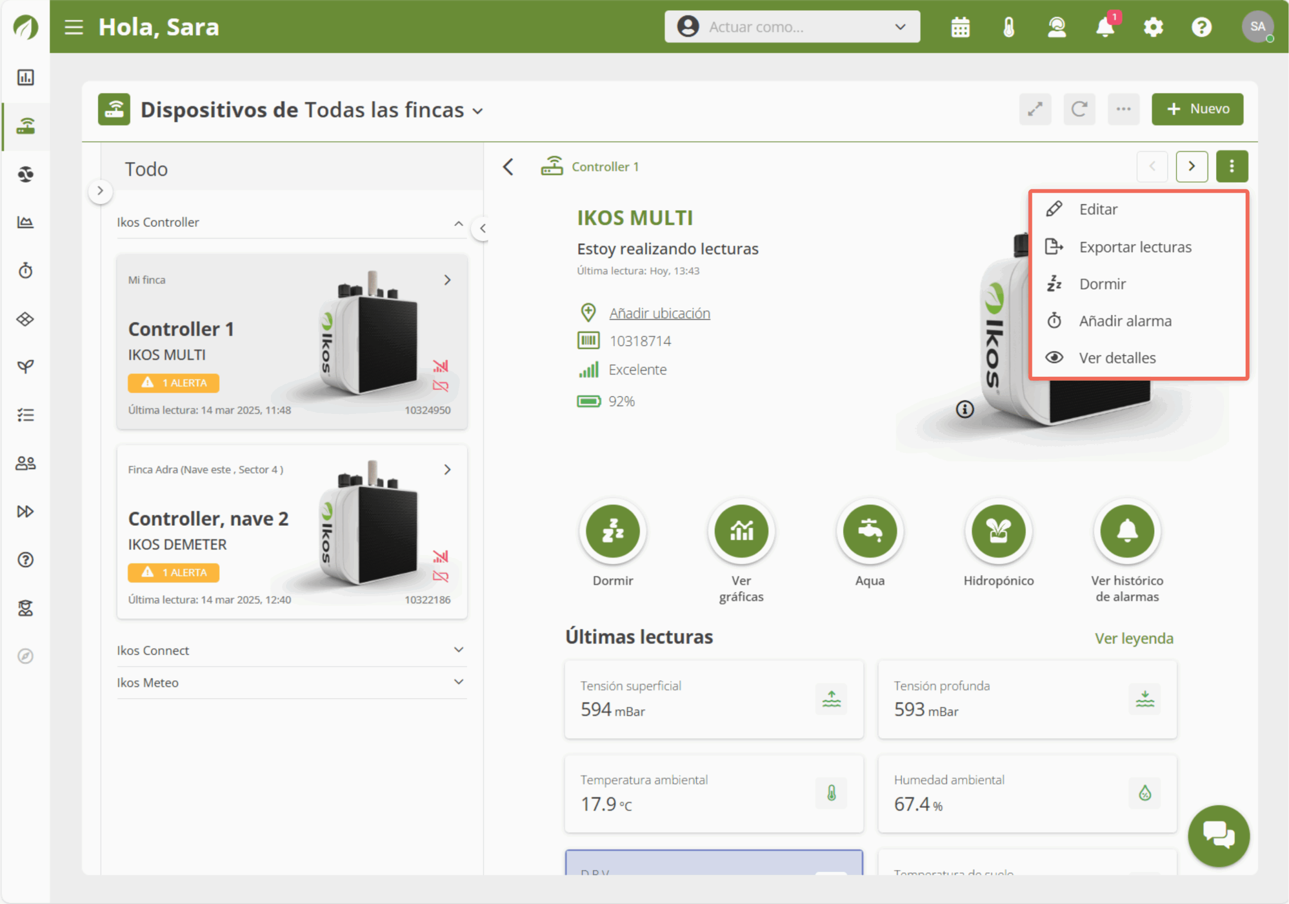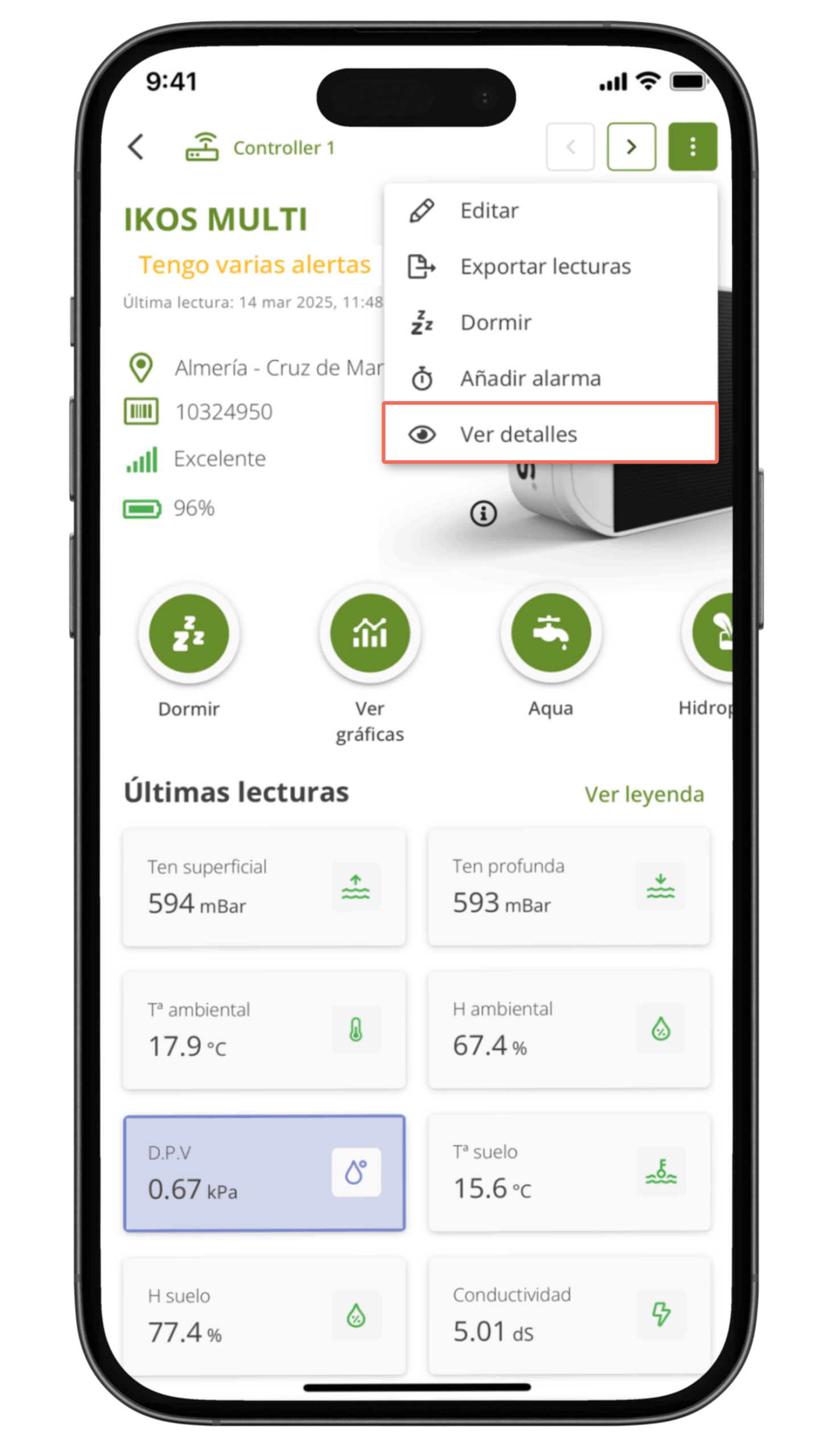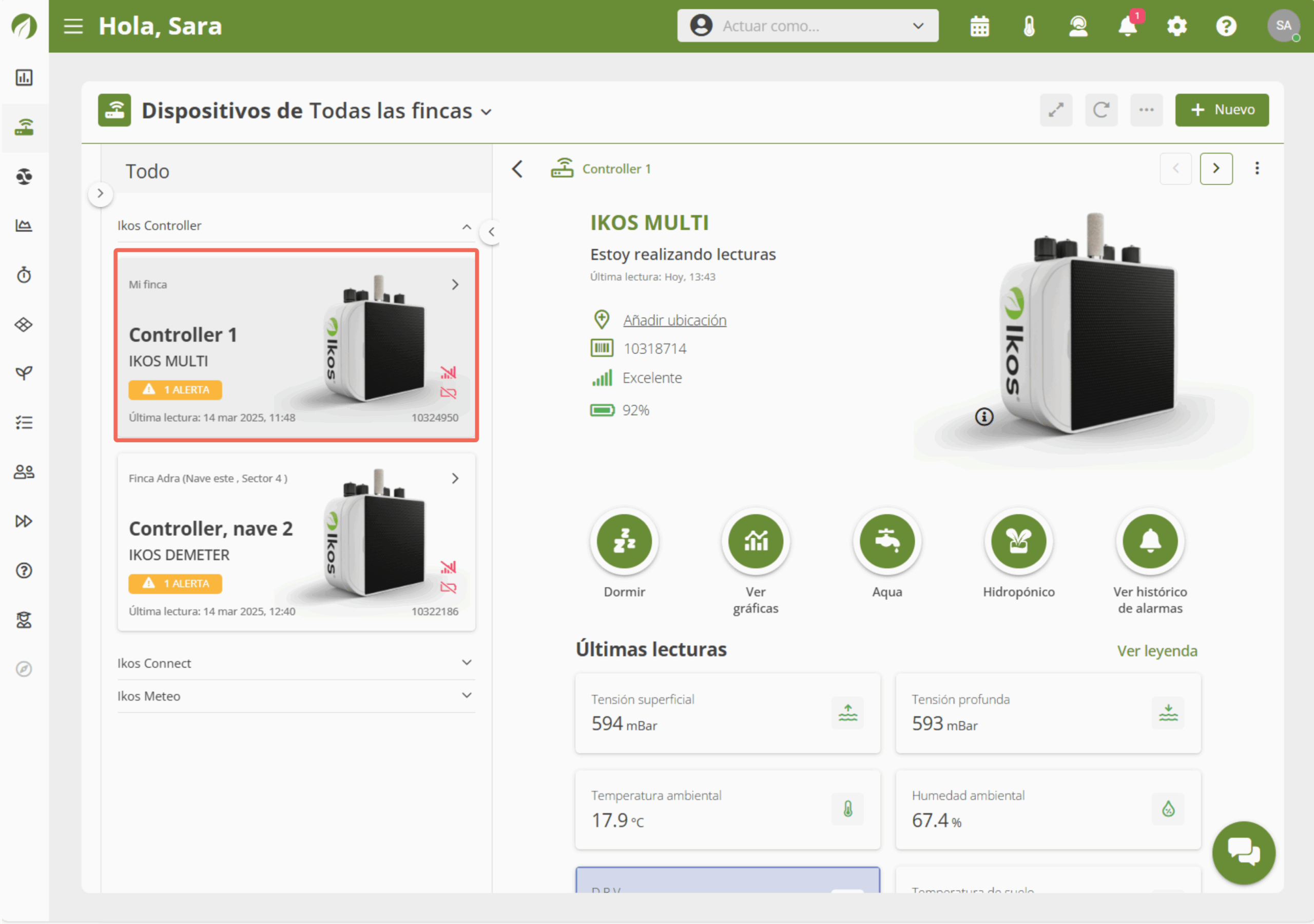 - En la pantalla Detalle del dispositivo verás toda la información del equipo y, en la sección Cultivos, los que están asociados a ese equipo 📋