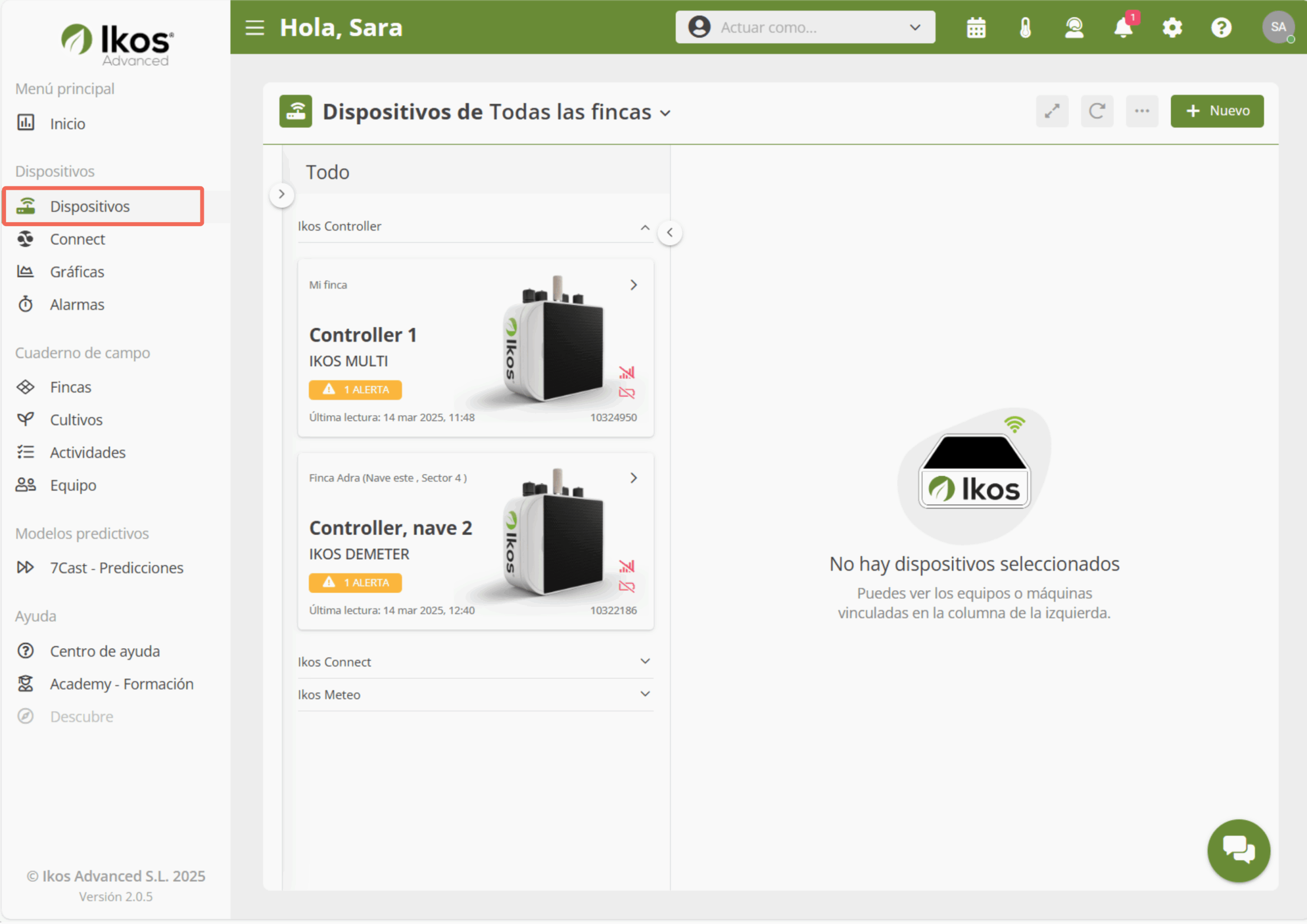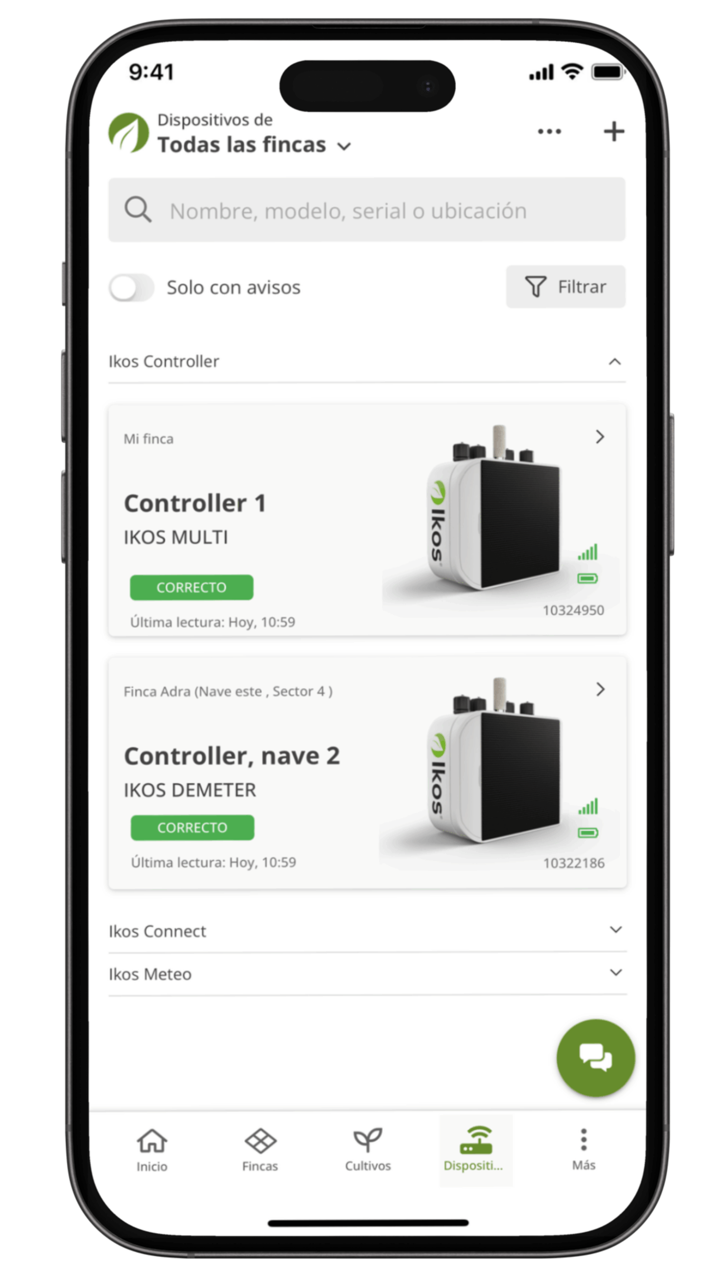 - Desde el menú inferior, pulsa Dispositivos. Se mostrará el listado de todos los equipos instalados en tus fincas.