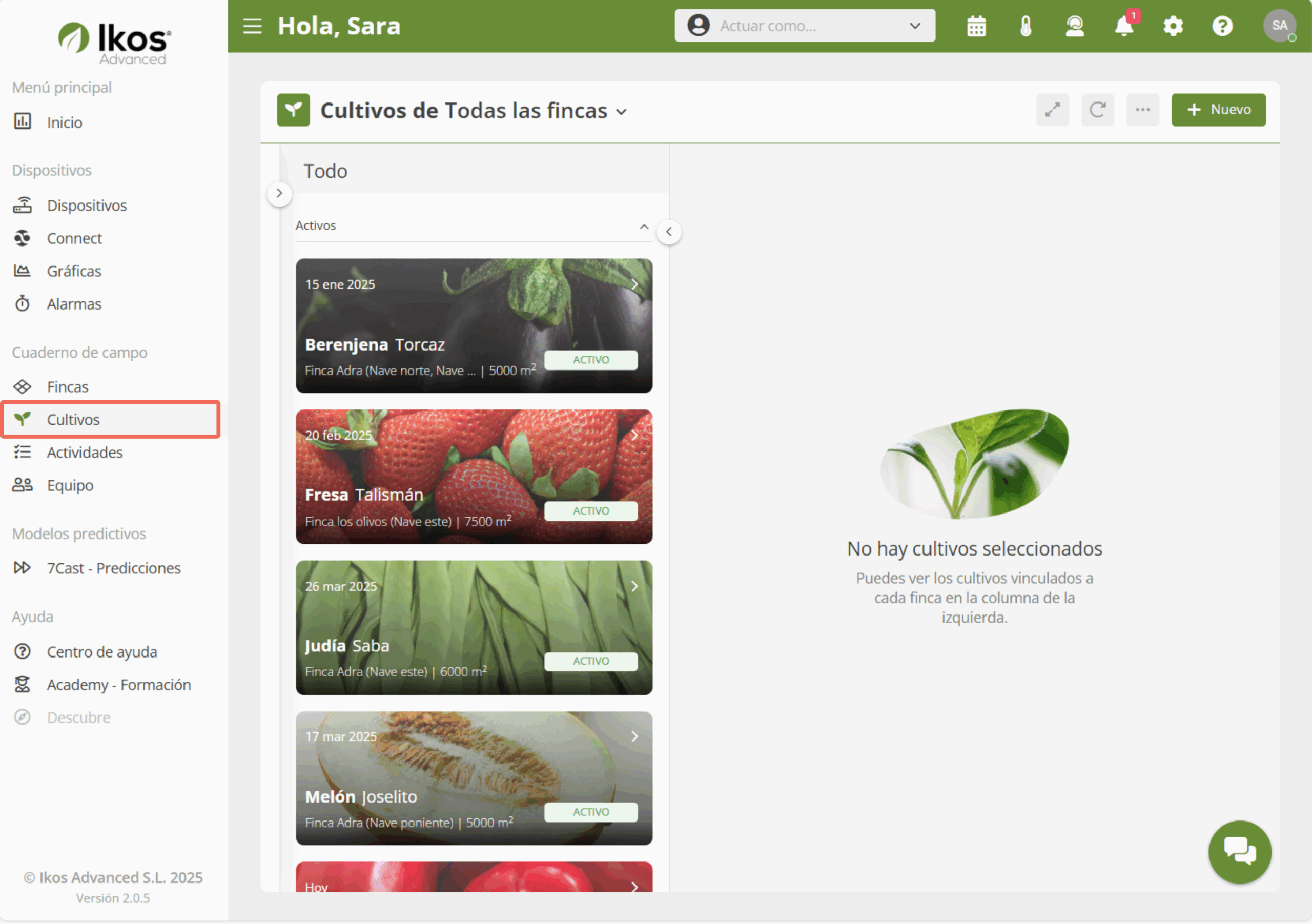 - Selecciona Cultivos. En la parte izquierda de la pantalla verás el listado con todos los cultivos que tienes activos.