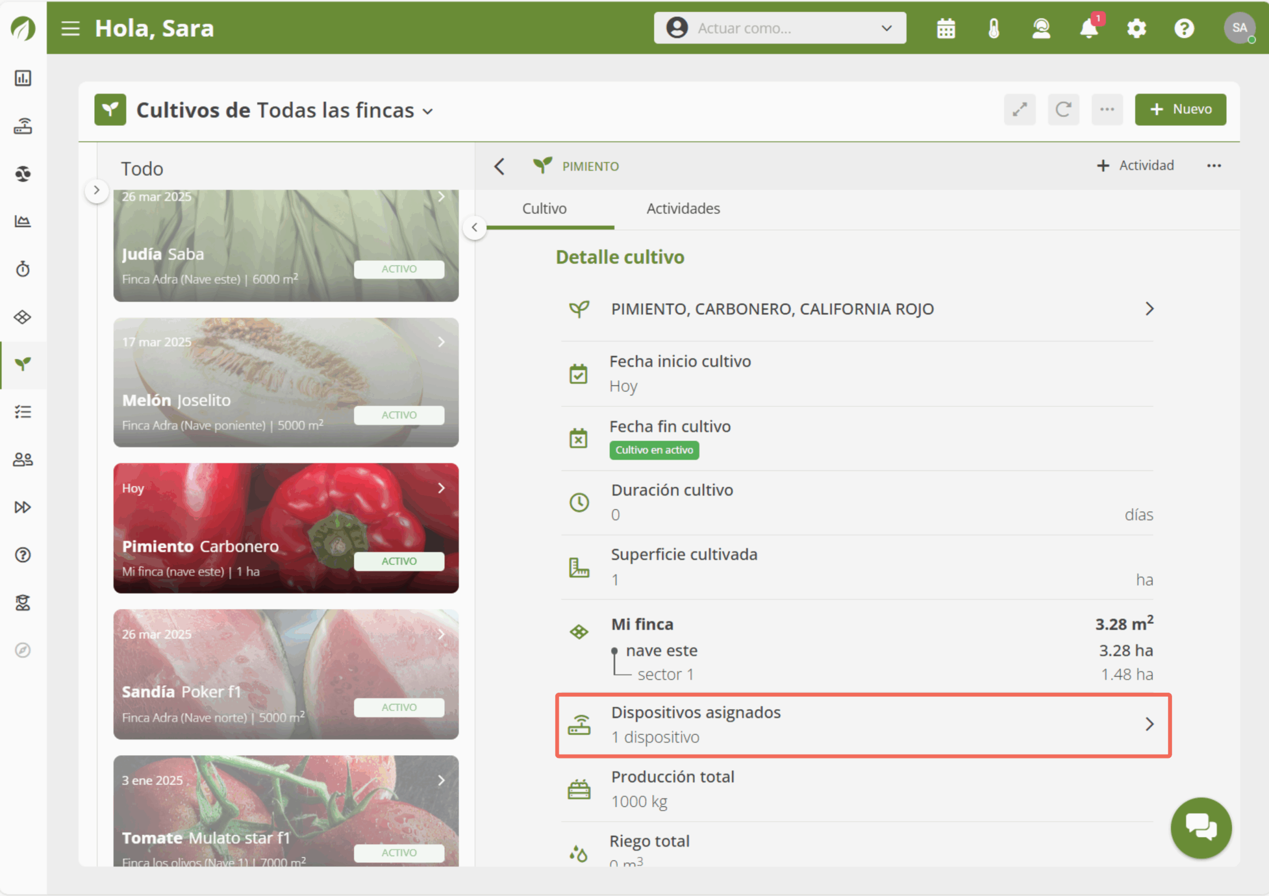 - Pulsa sobre el cultivo y se mostrará la pantalla Detalle cultivo, donde verás toda la información del mismo. En la sección Dispositivos asignados aparecerán los equipos vinculados ⚙️