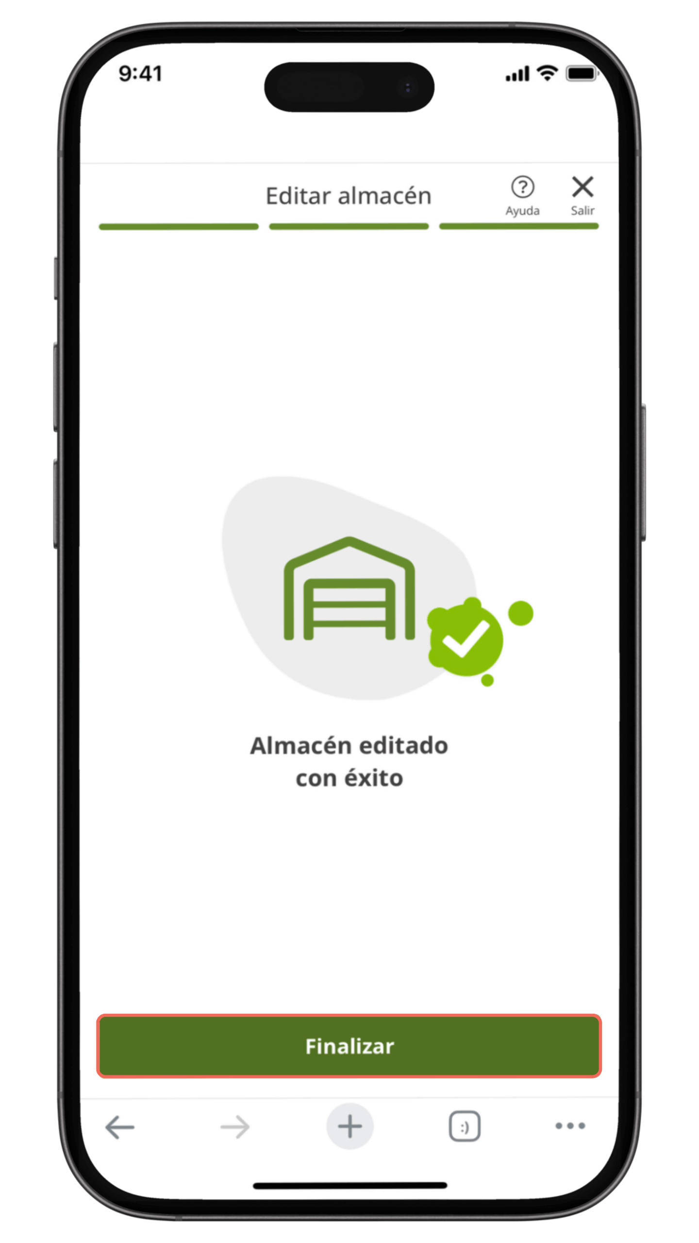 Cuando aparezca el mensaje “Almacén editado con éxito”, selecciona Finalizar ✅