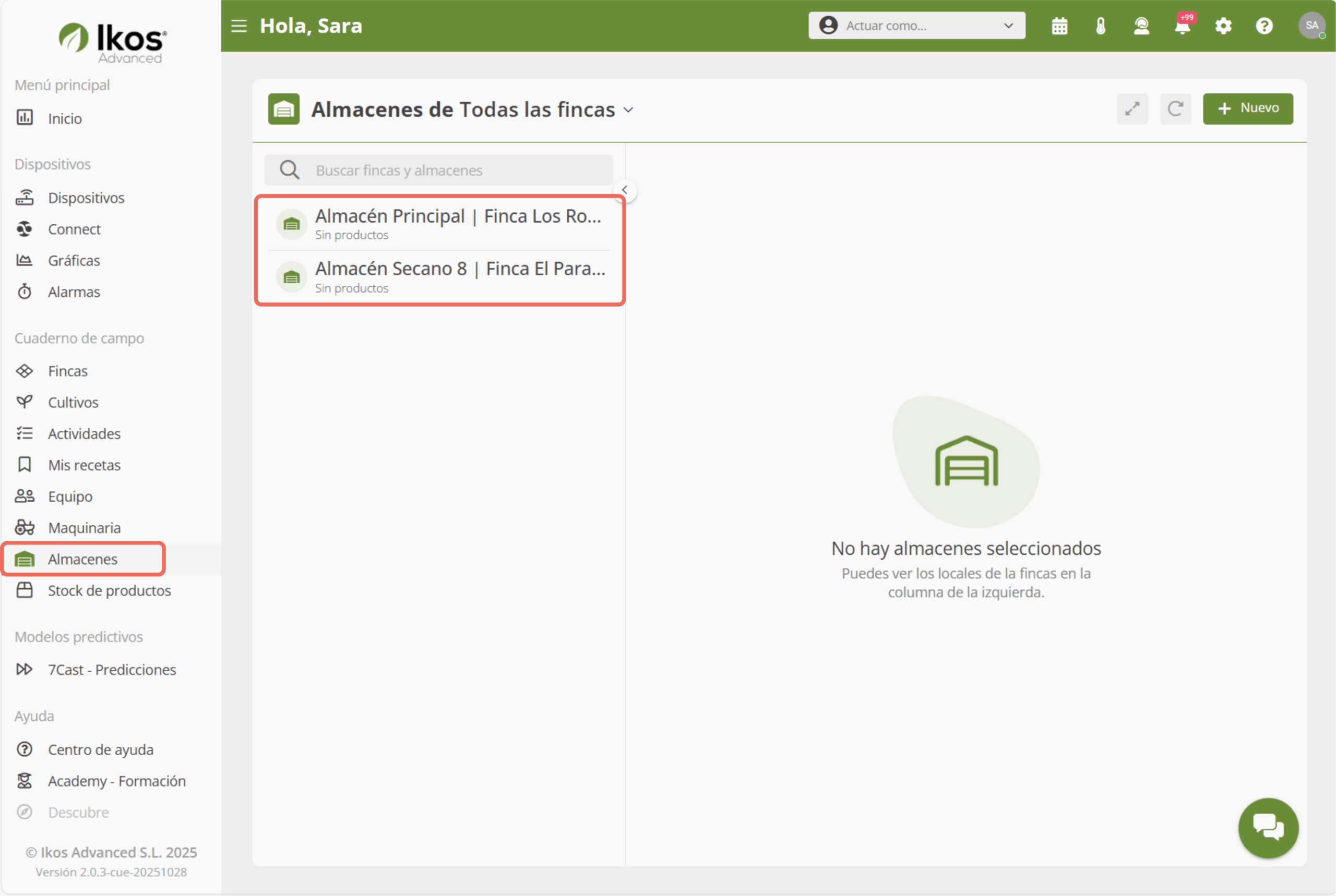 - Pulsa sobre el almacén que necesites modificar, por ejemplo Almacén Secano 8 | Finca El Paraíso.