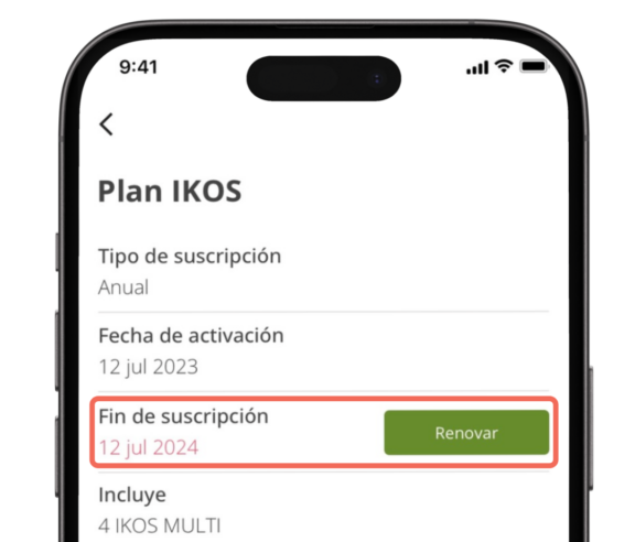 Una vez renovado el servicio volverás a tener acceso durante un año más a nuestros servicios en la aplicación y se actualizará la información del vencimiento de tu próxima suscripción dentro de tu plan de Ikos.