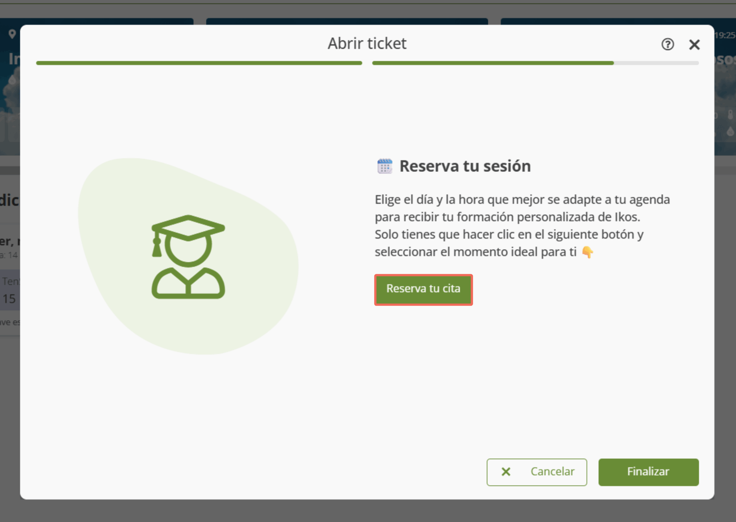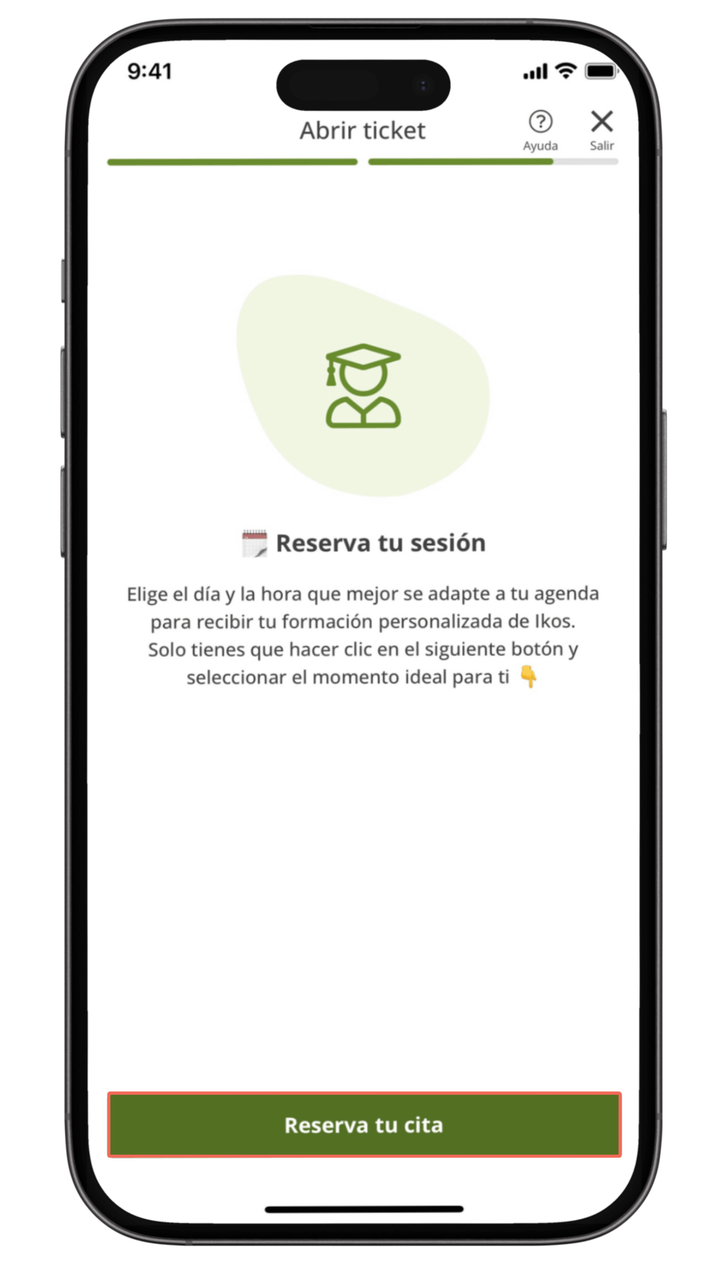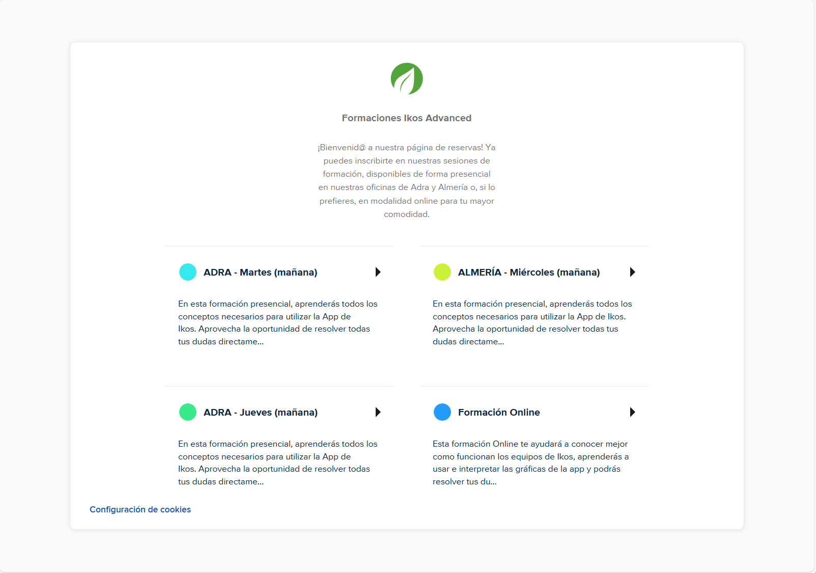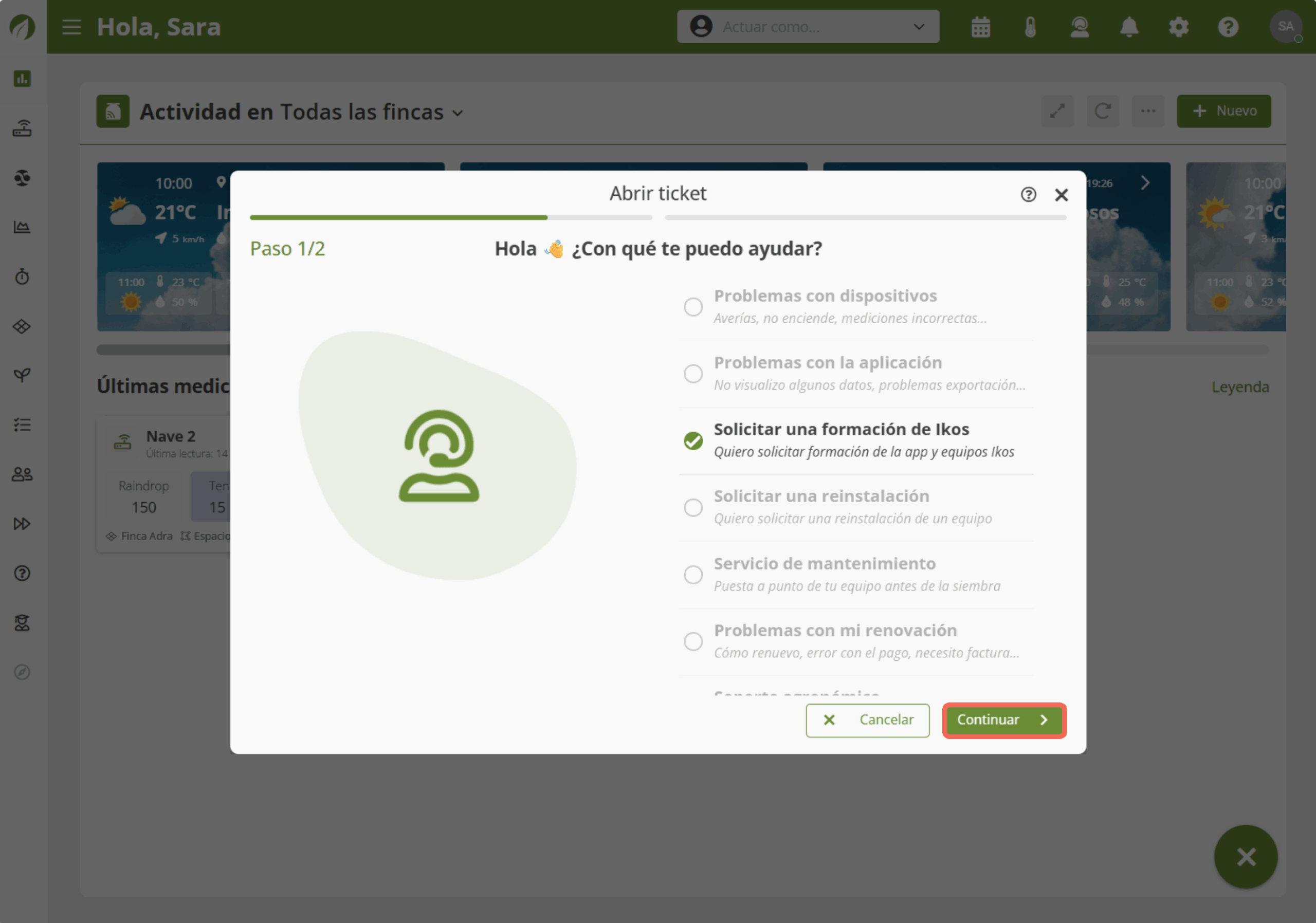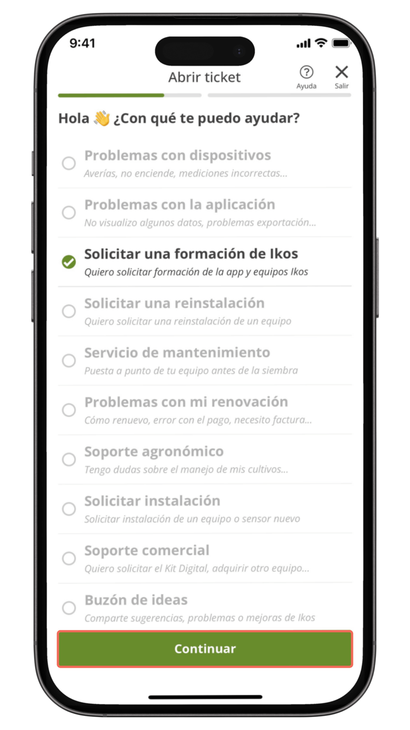 - Selecciona “Solicitar una formación de Ikos”. Esta opción te permite programar una sesión personalizada para conocer mejor el funcionamiento de la app y los equipos 🌱