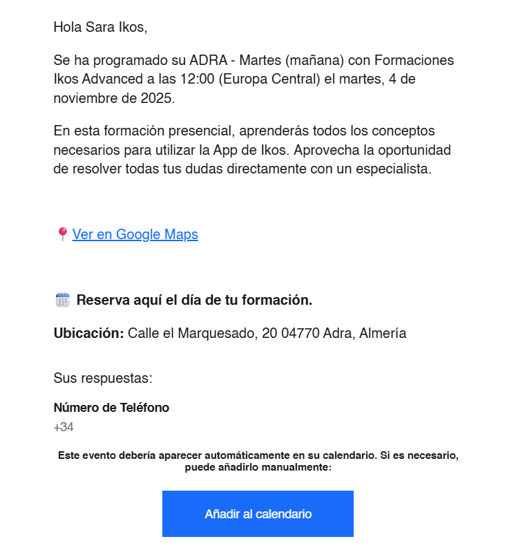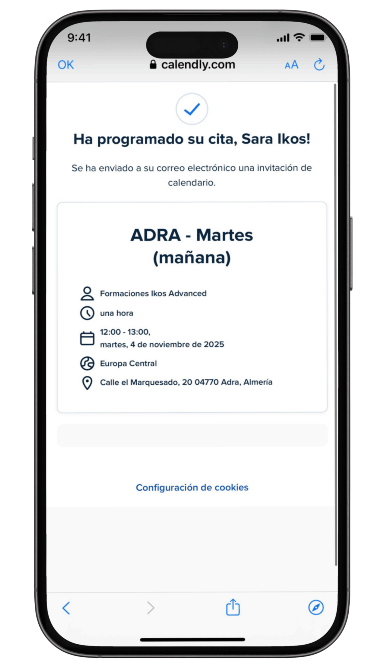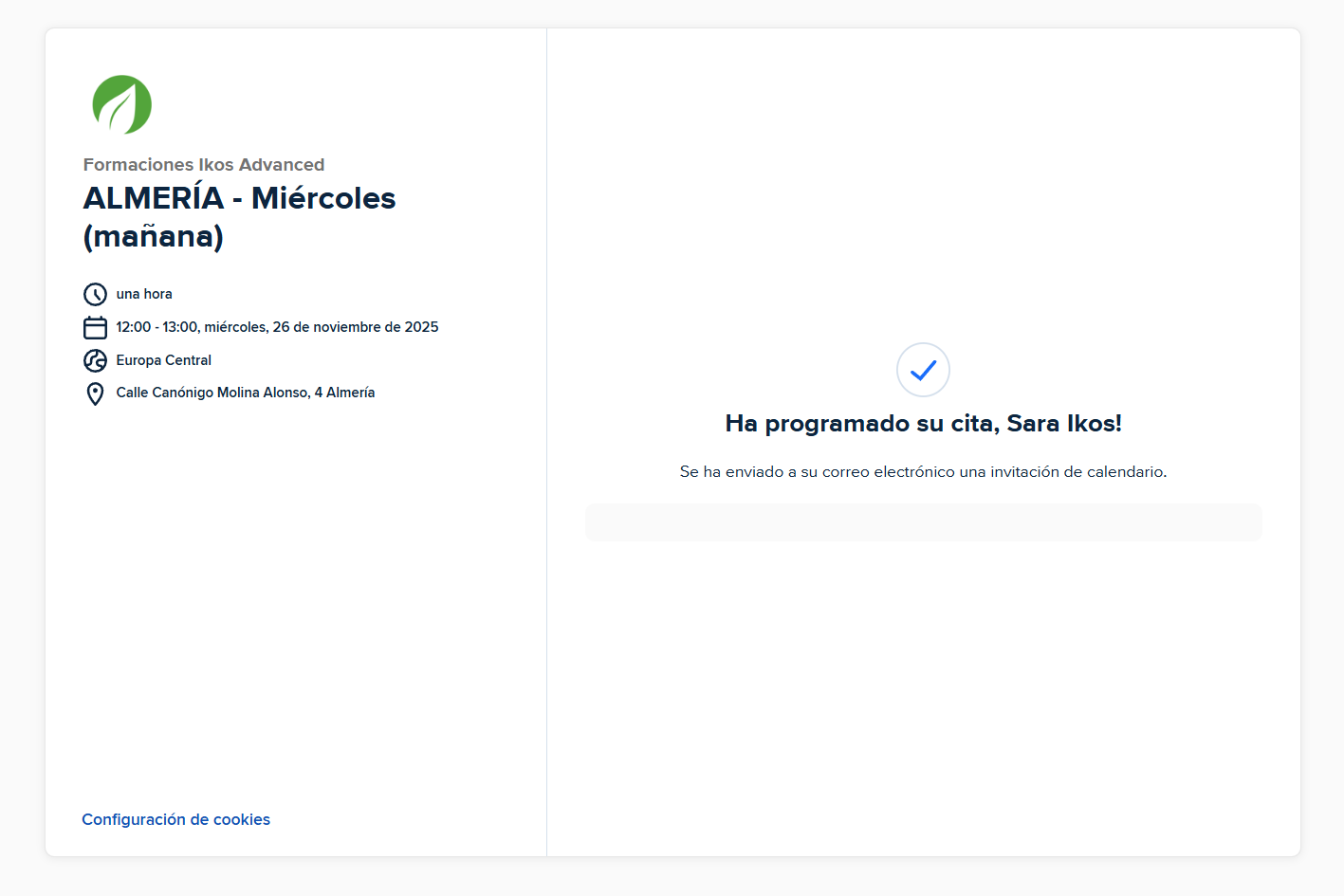 - Verás el mensaje “Ha programado su cita” y recibirás un correo de confirmación con todos los detalles de tu formación.