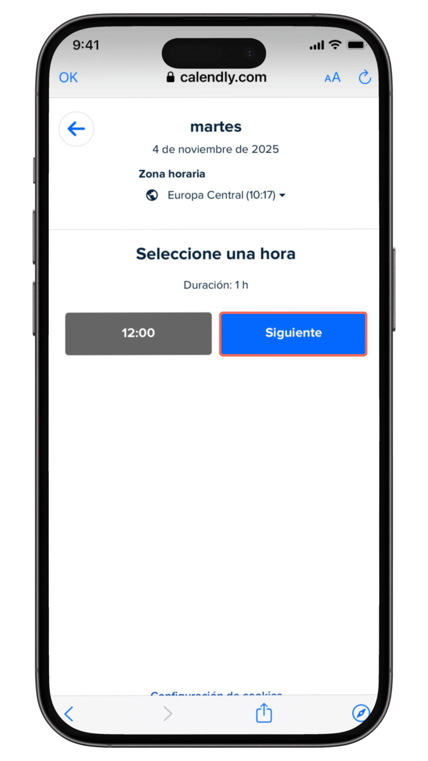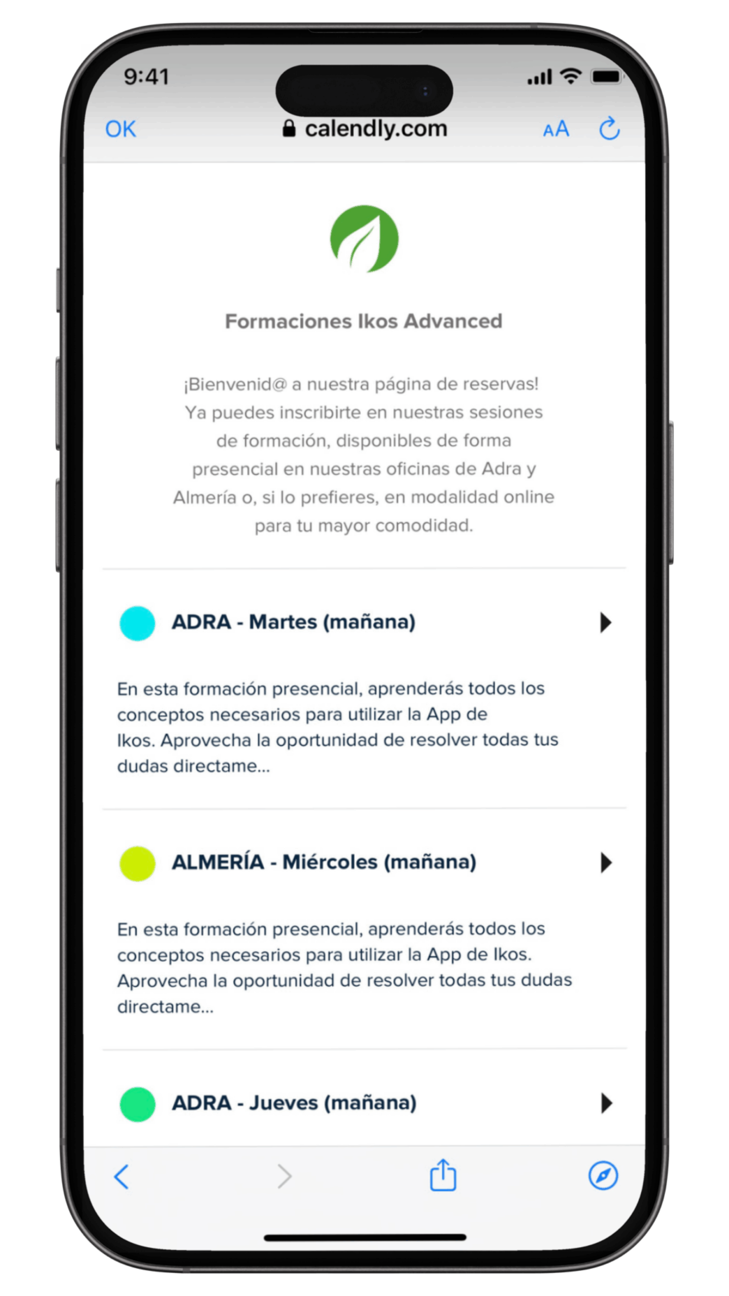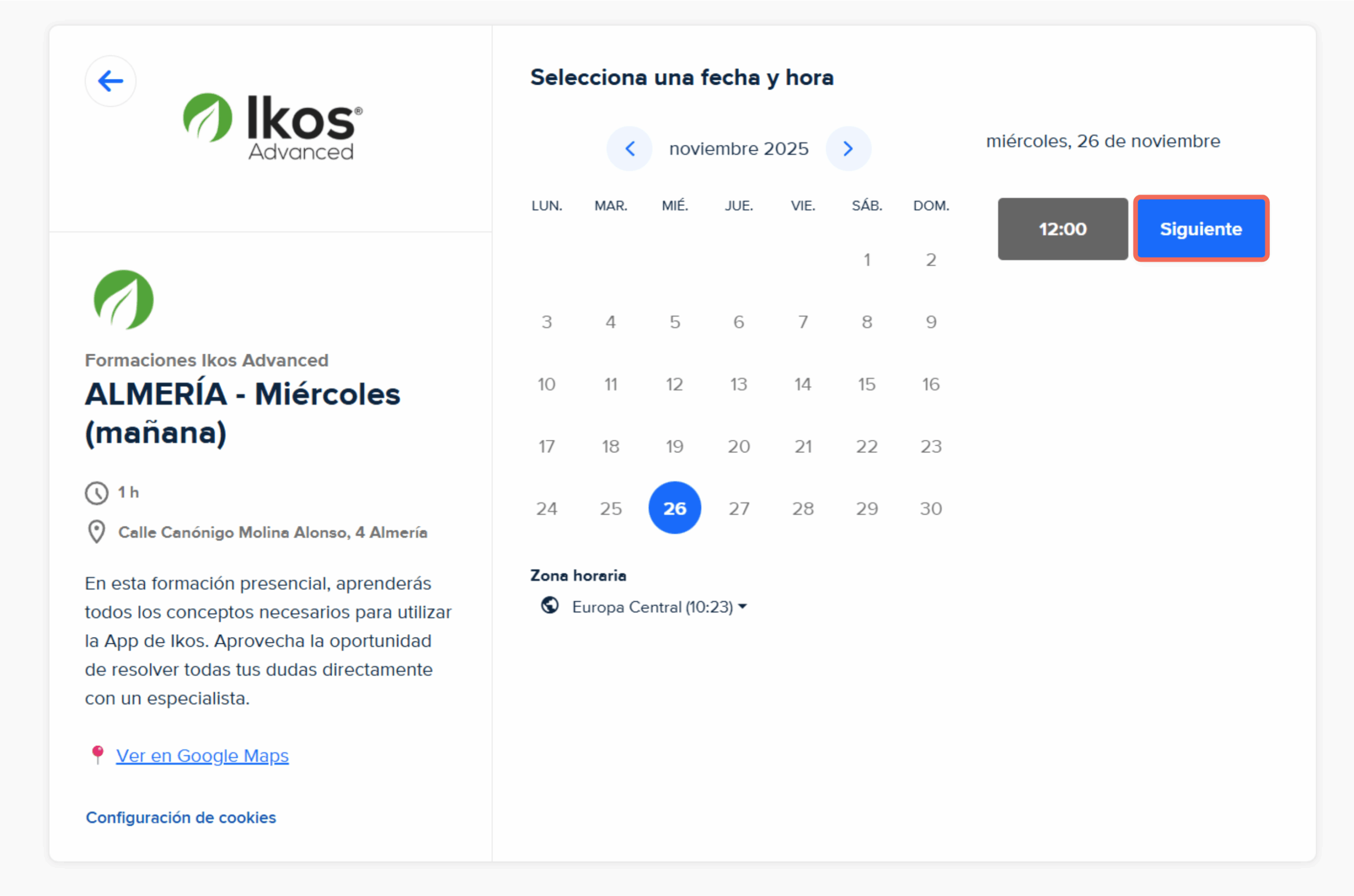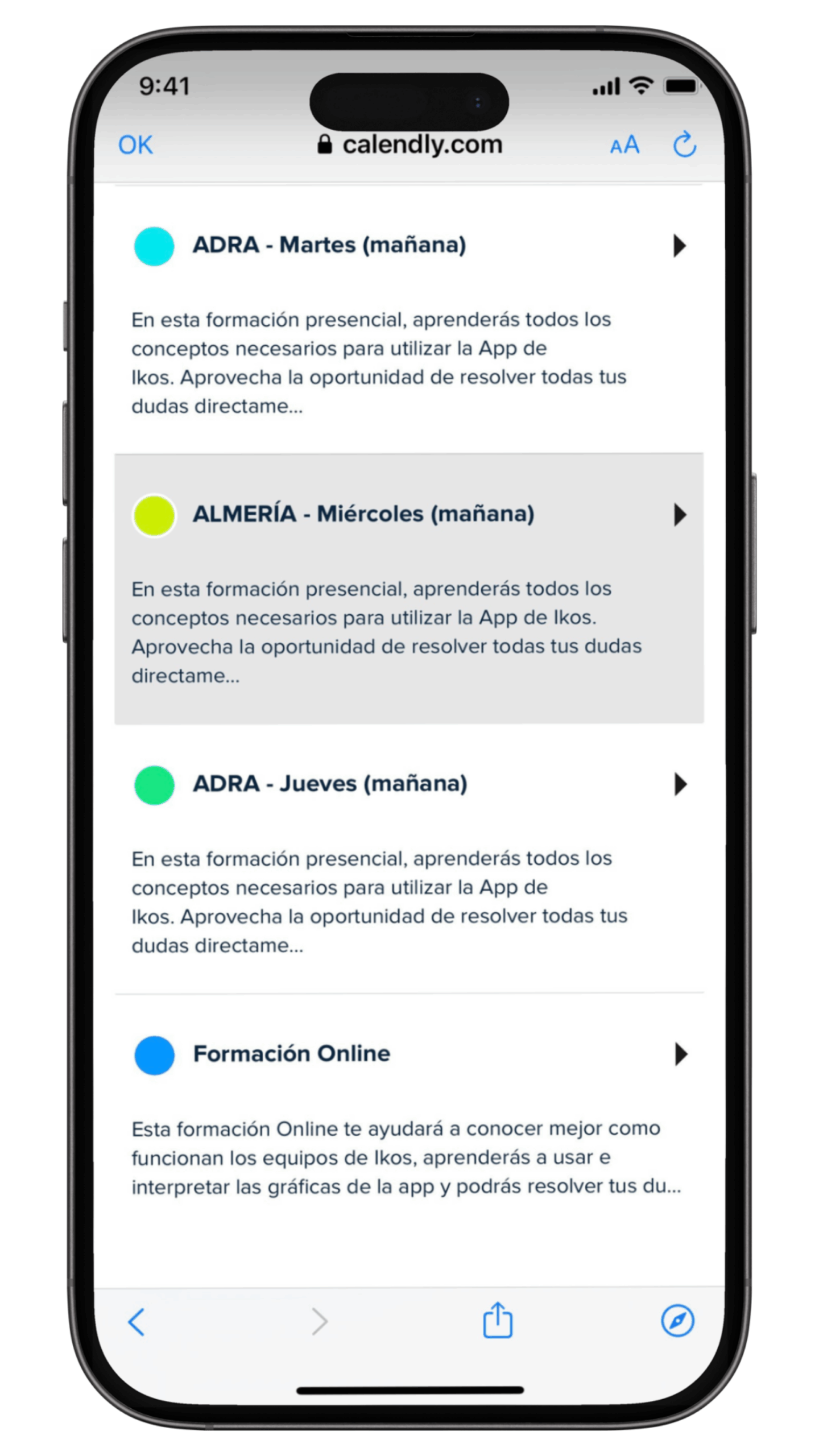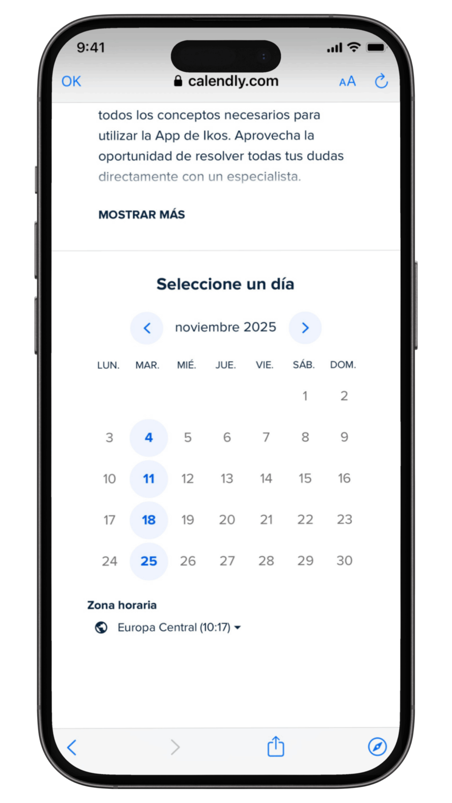 Al pulsar Reserva tu cita, se abrirá la página de Calendly con las sesiones disponibles: