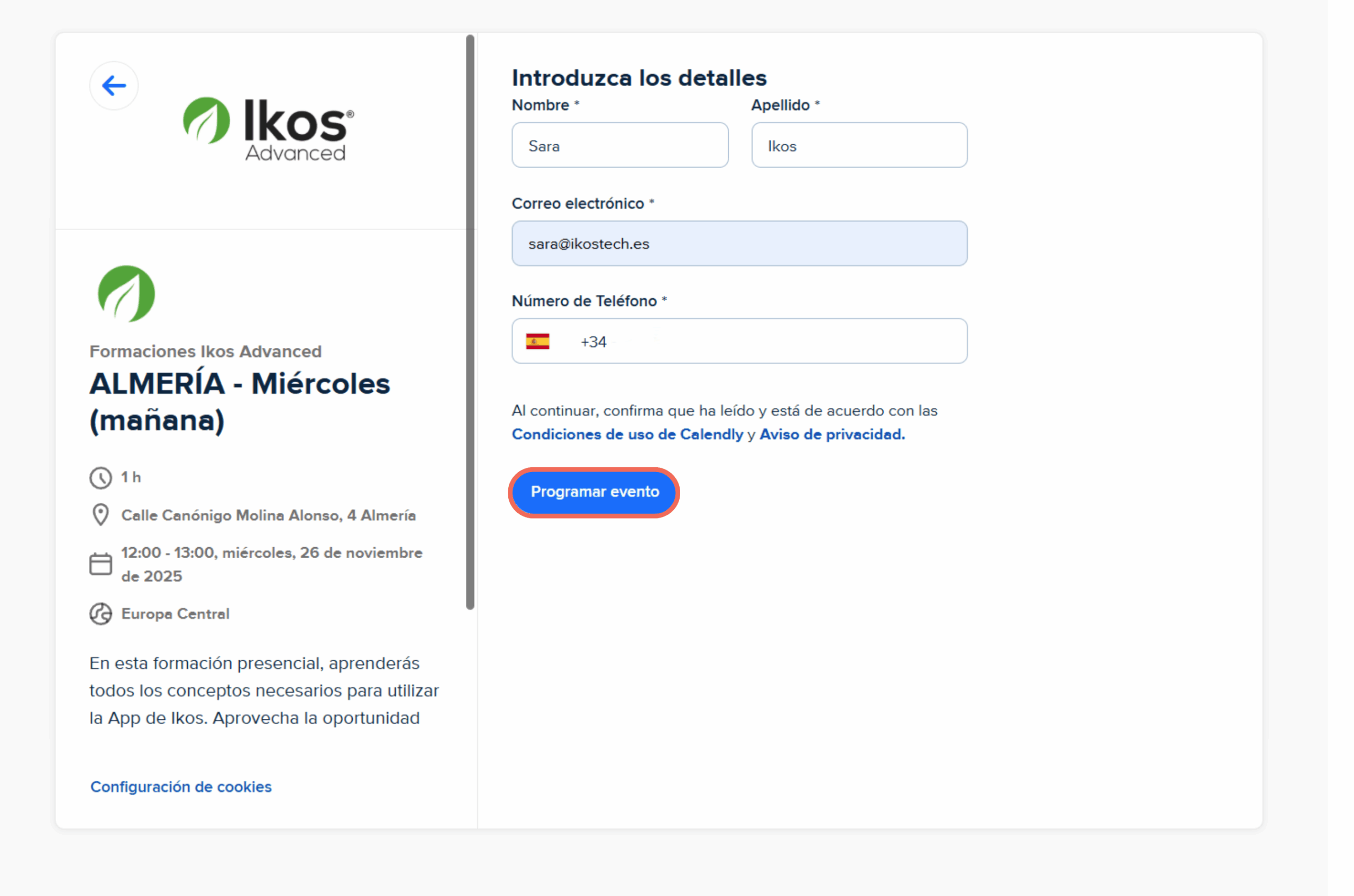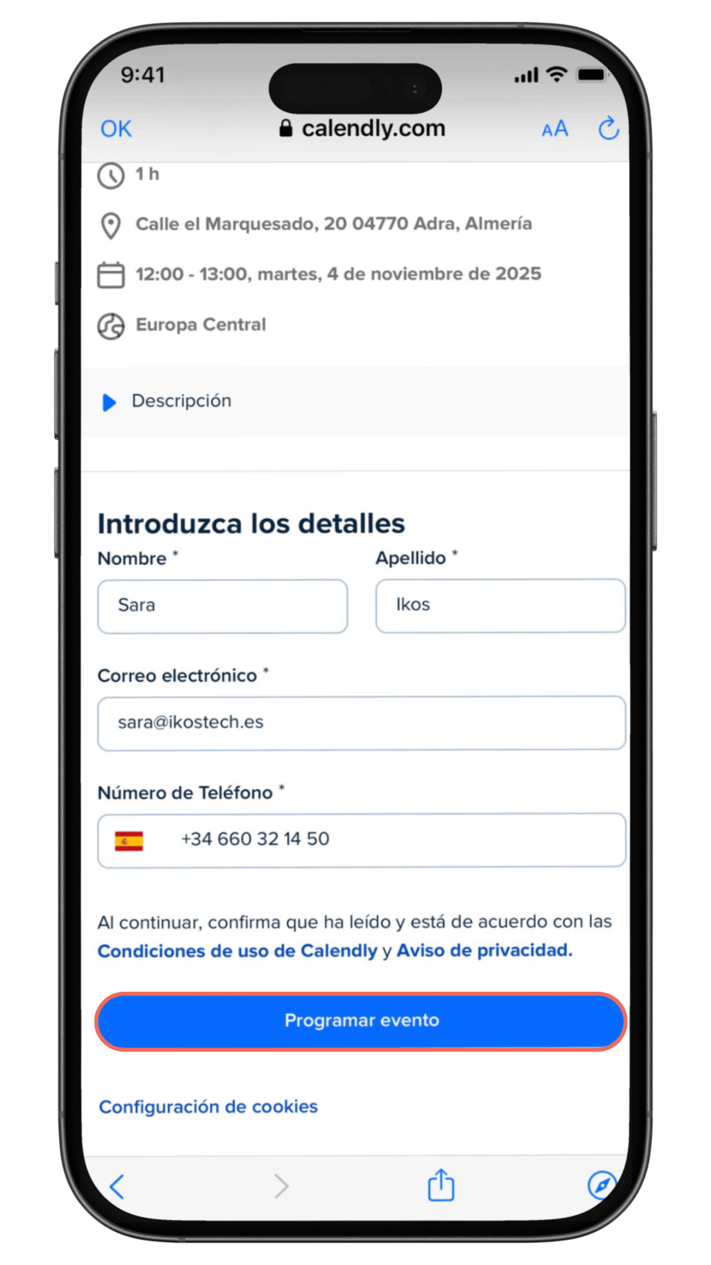 - Rellena Nombre, Apellidos, Correo electrónico y Número de teléfono. Pulsa Programar evento para confirmar 📝